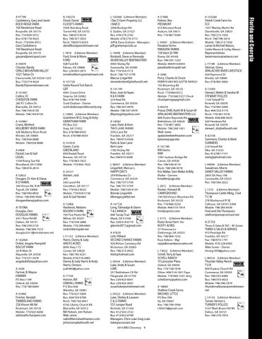A 102548 Shiloh Creek Farm Inc SCF 1037 Manley Martin Rd Danielsville, GA 30633 Res: 706/215-7050 Rnch: 706/796-5410 Mobile: 706/215-7050 Lanier & Michell Mason, Caleb Mason & Colby Mason Representatives laniermason@netzero.com L 77146 (Lifetime Member) Skinner, Ginny APALACHEE RIVER LIVESTOCK 438 Raymond Dr Winder, GA 30680 Res: 678/963-0800 A 13360 Stewart, Walter & Sandra M. STEWART POLLED 1130 Falstaff Dr Roswell, GA 30076 Res: 770/993-3899 Bus: 404/252-3170 Rnch: 770/267-3516 Mobile: 404/406-0025 920 Hembree Rd. Roswell, GA 30076 stewart_dr@bellsouth.net A 82108 Summers, Charles & Mark SUMMERS 218 Sewell Rd Elko, GA 31025 Res: 912/987-7151 waregl@hotmail.com L 44836 (Lifetime Member) Sweatman, Morris SANDY VALLEY FARMS 2830 GA Hwy 198 Carnesville, GA 30521 Res: 706/384-2622 L 1370 (Lifetime Member) Thompson Cattle Mktg., Fred TCM 276 Blackwood Pl SE Calhoun, GA 30701-3908 Mobile: 706/263-6336 Fred and Ola Thompson olathompson@comcast.net A 21152 Three G Sales & SVC - M. Green THREE G SALES & SERVICE 915 Pearidge Rd Franklin, GA 30217 Fax: 706/675-1797 Mobile: 979/229-6563 Mike Green - Owner threeg1990@yahoo.com L 46518 (Lifetime Member) Thunder Valley Ranch TVR 859 Erastus Church Rd Commerce, GA 30530 Res: 706/335-4069 Bus: 706/335-0022 Mobile: 706/296-3979 thundervalleyran@windstream. net L 15134 (Lifetime Member) Turner, Vernon L. TURNER’S POLLED 5147 Mark Brown Rd NE Dalton, GA 30721 Res: 706/278-7814