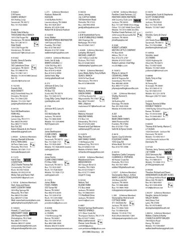 L 98789 (Lifetime Member) Panther Creek Partners, LLC PANTHER CREEK PARTNERS 456 Country Club Lane Jackson, TN 38305 Bus: 731/287-9948 Chris Clegg Other: 731/287-9948 Dave Dahl Mobile: 731/513-3844 Jim Ellis Panther Creek Partners, LLC 2292 Lower Brownsville Rd Jackson, TN 38305 jimellis@eplus.net A 3346 ROBERT LATIMER MILTON CATTLE COMPANY PO Box 6038 Milton, TN 37118 Res: 615/273-2787 Mobile: 615/337-6307 Robert Latimer, Chief Mgr. mccllc98@cs.com A 102872 Rhyne Jr, James H CEDAR HILL FARM 8455 N Trigonia Rd Greenback, TN 37742 Res: 865/661-6309 Bus: 865/777-2150 jrhyne@snellingknoxville.com L 280 (Lifetime Member) Shelby, Ronnie D. SHELBY 58 Rushing Rd Ethridge, TN 38456 Res: 931/829-3536 Mobile: 615/300-3536 A 261 Smith, Seth BEAR CREEK FARM’S 5685 Pinewood Rd Franklin, TN 37064 Res: 615/591-7700 Seth M. & Elynor Smith A 8418 Spann, Guy & Johnnie FOUR BAR S FARM 1055 Gray Rd White Bluff, TN 37187 Res: 615/797-3996 A 34310 Stephens Cattle Company CLARENCE E. STEPHENS 40 Hester Creek Rd Flintville, TN 37335 Res: 931/937-8991 eddies100@bellsouth.net L 9237 (Lifetime Member) Stonecipher, Mary L. & Rick MARY L & RICK STONECIPHER 530 Bascomb Rd Jackson, TN 38305 Res: 731/668-0669 Bus: 731/664-7400 ricks@praxiscompanies.com L 283 (Lifetime Member) Stonecipher, Rick & Scott COTTAGE FARM 971 Old Bells Rd Jackson, TN 38305 Bus: 731/664-7400 Fax: 731/664-6258 Mobile: 731/616-7702 Rick’s Work 800/443-7269 ricks@aquariusproducts.com
