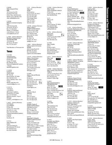 A 99288 Williams Livestock Company WLC 2580 Oak Grove Rd Savannah, TN 38372 Res: 731/926-6459 Mobile: 731/926-6459 Justin Williams - Owner wlc423@bellsouth.net L 27944 (Lifetime Member) Woodson, Dwayne & Jane SELDOM INN FARM 730 Griffin Rd Mc Kenzie, TN 38201 Res: 731/235-2873 Total Members in Tennessee: 64