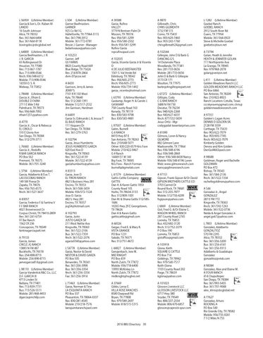 A 39588 Garza, Rufino VALLEY 3779 N Bentsen Palm Dr Mission, TX 78574 Res: 956/581-3299 Bus: 956/580-2502 Rnch: 956/581-3299 Rufino Garza rvprufino@aol.com A 102035 Garza, Vicente Garza Jr & Vicente O 4 DE JULIO BEEFMASTER 1501 S. Val Verde Rd Edinburg, TX 78542 Res: 956/605-2773 Rnch: 956/605-2773 Mobile: 956/739-1492 garza_vicente@hotmail.com L 63795 (Lifetime Member) Gaskamp, Roger H. & Carole J. GASKAMP 758 County Road 163 Kenedy, TX 78119 Res: 830/583-9798 Bus: 830/583-9881 L 97507 (Lifetime Member) Gates, Burnell G 4 RANCH 8410 Hwy 87 E San Antonio, TX 78263 Bus: 210/648-5071 Other: 830/220-0579 Kris Fore Mobile: 210/422-9467 G 4 Ranch 14449 E F M 140 Big Foot, TX 78005 Kris Fore - Ranch Forman burnell@bgmetals.com L 41579 (Lifetime Member) Gattis Cattle Company GATTIS Dan A. & Karen Gattis 1850 County Road 105 Hutto, TX 78634-3133 Bus: 512/809-1001 Dan M. & Shana Gattis 512/5851686 10265 Hwy 29 E Georgetown, TX 78626 Dan A & Karen Gattis gattiscattle@gmail.com A 68326 Geiger, Fred E. & Mary R. VISTA GRANDE PO Box 1231 Salado, TX 76571 Res: 512/751-4672