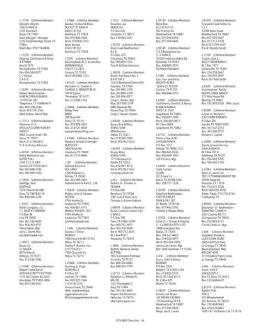 L 17739 (Lifetime Member) Albright, Billy W. TWO A RANCH 2105 Rivendell Bryan, TX 77807 Brad Albright - Manager 6105 Knightsbridge, Bryan, TX 77802 Brad’s Res: 979/774-4808 L 55276 (Lifetime Member) Allgood, Carl Kramer & Arnie A K FARM Box 631275 Nacogdoches, TX 75963 Res: 936/564-8277 C L Kramer C R 913 Nacogdoches, TX 75963 L 36291 (Lifetime Member) Askew, Mark & Sylvia ASKEW OPEN A RANCH 15199 F M 100 Telephone, TX 75488-4611 Res: 903/378-2166 Rnch: 903/378-2166 Mark Askew, Ranch Mgr L 17713 (Lifetime Member) Atkinson, H. A. APOLLOS DOWN YONDER RANCH 4465 County Road 14A Edna, TX 77957 Rnch: 512/798-4812 H. A. & Shirley Atkinson L 44130 (Lifetime Member) Autry, Monroe & Lou AUTRY’S M L 2305 V Z C R 2405 Canton, TX 75103-4221 Res: 903/848-1936 Bus: 903/848-1602 L 13056 (Lifetime Member) Baethge, Jack BAETHGE 10193 Ranch Rd 648 Doss, TX 78618-0116 Res: 830/669-2238 L 35321 (Lifetime Member) Barth Company, J. L. J. L. BARTH COMPANY P O Box 38 Elsa, TX 78543 Res: 361/526-4839 Bus: 956/262-4771 Henry Barth, Mgr Jerry L. Barth, Pres jerrybarth@aol.com L 10033 (Lifetime Member) Bauer, Cy CY BAUER 807 N Alamo Refugio, TX 78377 Res: 512/526-5082 L 31900 (Lifetime Member) Beaver Creek Ranch ARTHUR & BETTY DUTTON 1310 AN County Rd 2303 Montalba, TX 75853-3806 Res: 903/549-2922