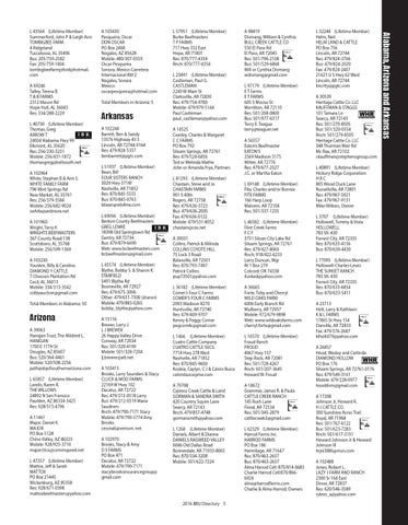 Arkansas A 102244 Barrett, Ben & Sandy 13576 Highway 45 S Lincoln, AR 72744-9164 Res: 479/824-5357 benbarrett@pgtc.com L 51937 (Lifetime Member) Bean, Bill FOUR SISTERS RANCH 3029 Hwy 371W Nashville, AR 71852 Res: 870/845-5555 Bus: 870/845-0763 bbean@wb4me.com L 69056 (Lifetime Member) Benton County Beefmasters GREG LEMKE 18398 Old Springtown Rd Gentry, AR 72734 Bus: 479/879-6690 Web: www.bcbeefmasters.com bcbeefmasters@gmail.com L 45574 (Lifetime Member) Blythe, Bobby S. & Sharon K. STARFIELD 5491 Blythe Rd Booneville, AR 72927 Res: 479/675-3006 Other: 479/651-7300 (sharon) Mobile: 479/883-0265 bobby_blythe@yahoo.com A 15116 Brewer, Larry J. L J BREWER 26 Happy Valley Drive Conway, AR 72034 Res: 501/329-4199 Mobile: 501/328-7204 lj.brewer@att.net A 103415 Brooks, Larry Saunders & Stacy CLUCK & MOO FARMS 22169 W Hwy 102 Decatur, AR 72722 Res: 479/212-0518 Larry Bus: 479/212-0519 Maria Saudners Rnch: 479/790-7171 Stacy Mobile: 479/790-5774 Amy Brooks cessna6@verison. net A 102970 Brooks, Stacy & Amy D S FARMS PO Box 471 Decatur, AR 72722 Mobile: 479/790-7171 stacybrooksinsurancegroup@ gmail.com