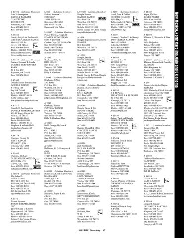 L 20527 (Lifetime Member) Kliesen, Kenneth & Dorothy KLIESEN 9580 Ferguson Rd Beggs, OK 74421 Res: 918/267-4081 Fax: 918/831-8666 Kenneth L Kliesen II A 236 Kreger, Joe & Joe Bayne KREGER 6301 Waterford Blvd Ste 440 Oklahoma City, OK 73118 Bus: 405/340-0852 Rnch: 580/628-3848 Other: Joe Bayne: 405/206-9560 Fax: 405/843-9749 Mobile: Joe SR: 580/763-1617 Joe Bayne: 405/206-9560 20515 W Oakland Ave Tonkawa, OK 74653 Joe Kreger & Joe Bayne joe.kreger@nmfn.com L 237 (Lifetime Member) Kreger, Ron M. BOIS D’ARC 1839 West Tower Rd Ponca City, OK 74601 Res: 580/762-8951 Bus: 580/762-8944 Rnch: 580/628-3848 Joe Kreger, Mgr. 20515 W Oakland Ave Tonkawa, OK 74653 A 40686 Lafferty Beefmasters LAFFERTY 105 Mollie Lane Anadarko, OK 73005 Res: 405/247-9426 Bill M. Lafferty A 28528 Lazy A Ranch LAZY A RANCH Rt 4 Box 615 Checotah, OK 74426 Res: 918/473-6026 Bus: 918/473-4125 R. L., Lorene & Bob Anderson lazyaranchok@aol.com A 11584 Leopard, Jimmy LEOPARD’S RAFTER L 71111 S. 266 Rd Wagoner, OK 74467 Res: 918/485-9348 Bus: 918/485-1200 Rnch: 870/356-5581 182 Miller Rd Langley, AR 71952