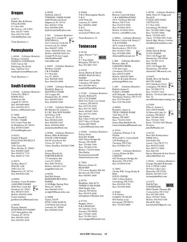 L 262 (Lifetime Member) Brewer, John H. CANDIES CREEK 1700 Ann Lane Cleveland, TN 37312 Res: 423/476-4966 Mobile: 423/593-3443 John H. & Gayle Brewer gccfarmgirl@aol.com L 263 (Lifetime Member) Buford, James C. F BAR L FARMS 4720 Harpeth - Peytonsville Rd Thompson Station, TN 37179 Res: 615/794-4413 Bus: 615/794-4184 A 98495 Burdette, Jason A. TWIN CREEKS FARM 7225 Hwy 57 W Ramer, TN 38367 Bus: 731/610-0506 Jason Alan Burdette Sr. twincreeksfarm@hotmail.com A 13101 Callahan, William S. & Phyllis WILLIAM S. CALLAHAN 129 Wedding Ln Chuckey, TN 37641 Res: 615/234-0718 L 22596 (Lifetime Member) Carver, Walter & Ella CARVER 902 Thompson Bridge Rd Maryville, TN 37801 Res: 615/856-3708 A 74801 Cheek, WM. Doug, Becky & Matt DOUG CHEEK 1625 Collins Hollow Lewisburg, TN 37091 Res: 931/359-5785 Bus: 931/359-8680 A 60442 D W Farms DARRYL WORLEY 835 Hatley Loop Savannah, TN 38372 Res: 731/925-8883