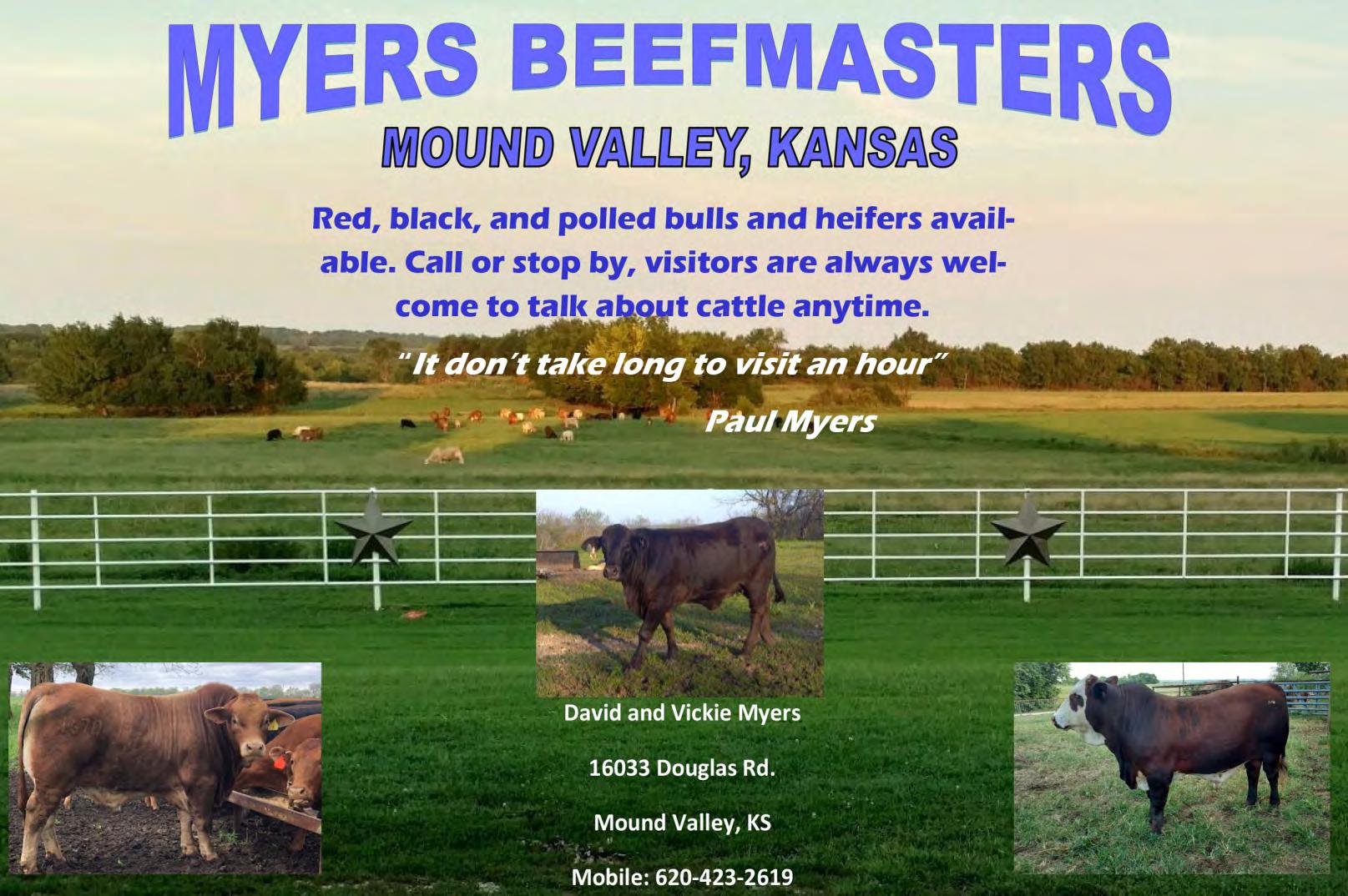 43+ ROCKING C - BULL C1140194 ID: BREEDER: 4921 STARBURST CHARLES MAULDING DOB: COLOR: DK RED MUL 4-9-21 VERY GENTLE MOSTLY PASTURE RAISED. TOP 10% MILKAND 30% $M. MYERS BEEFMASTERS - BRED COW - POLLED C1134930 BREEDER: SAFE TO: ID: 25/20 MYERS HOOD 016 - C1130324 DOB: COLOR: 4-25-20 RED VERY NICE RED COW COMING WITH HER 2ND CALF BRED TO OUT NEWEST HERD SIRE HOOD 016, THAT GOES BACK TO WIDE BUTT, 5502 AND CAVALIER, HE IS IN THE TOP 4% $TAND 15% MARBLING. 44 45+ MYERS BEEFMASTERS - BRED COW - POLLED C1134931 BREEDER: ID: SAFE TO: 92/20 MYERS WPR’S MIDNIGHT RIDER - C1115200 COLOR: DOB: 4-15-20 DK BROWN VERY NICE DARK BROWN COW COMING WITH HER 2ND CALF. BRED TO OUR NEWEST HERD SIRE HOOD 016.