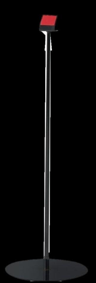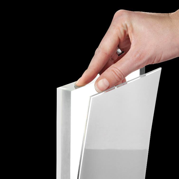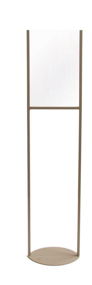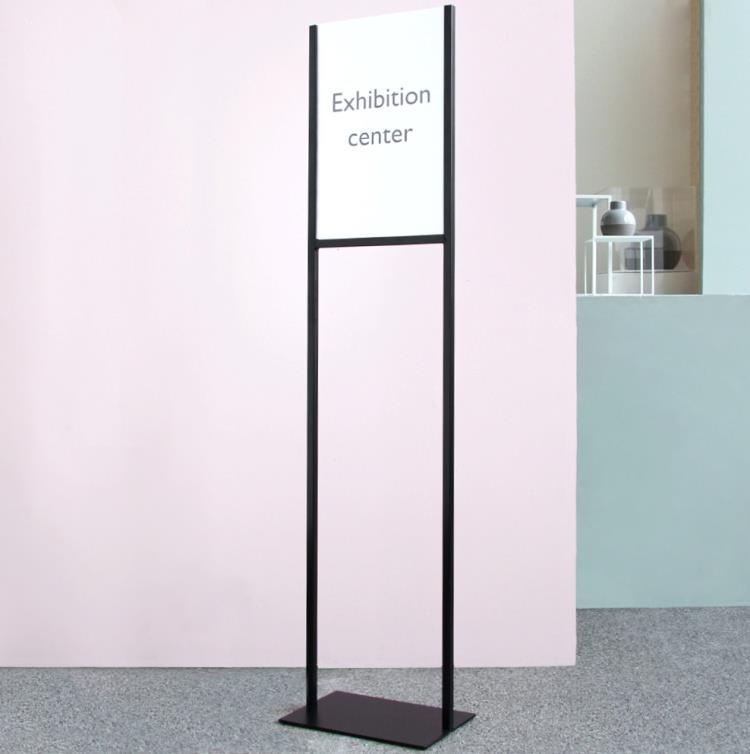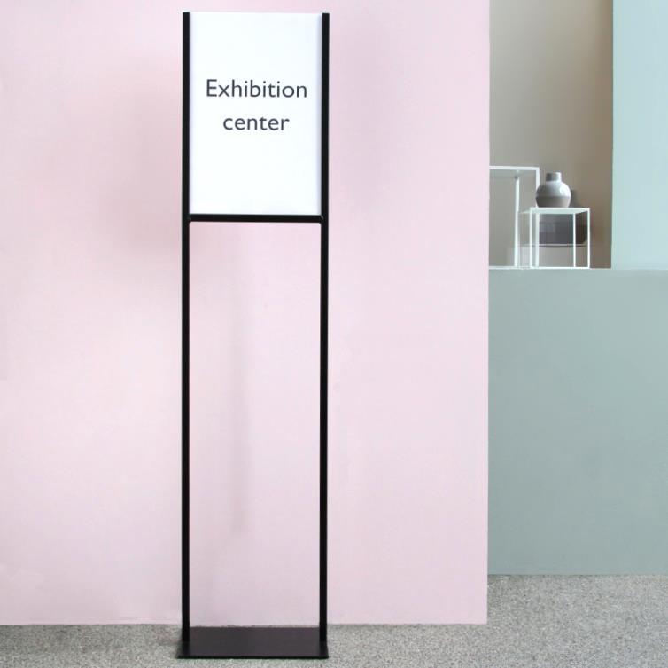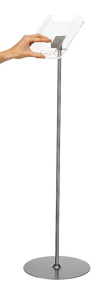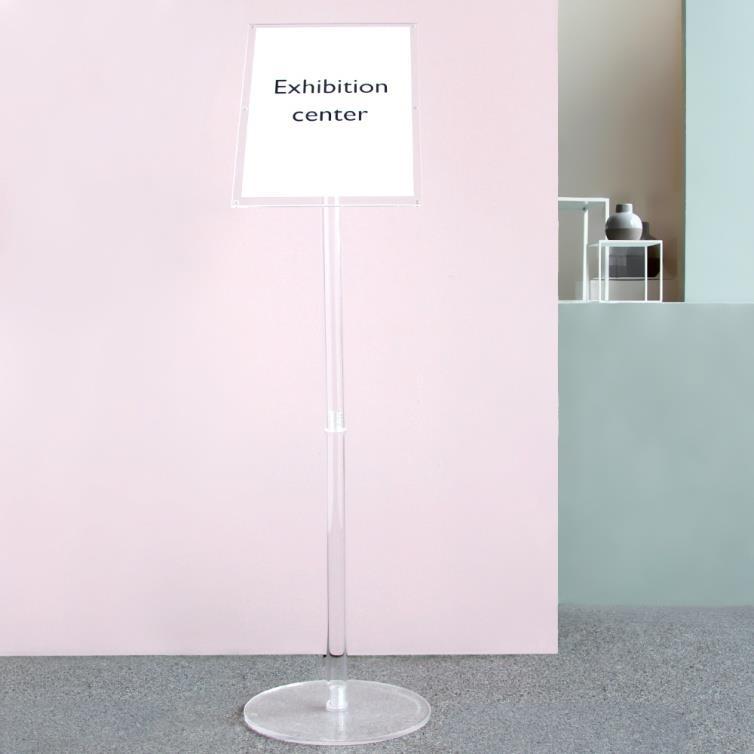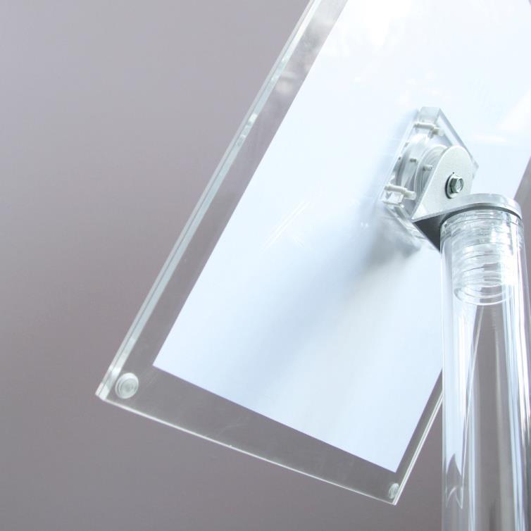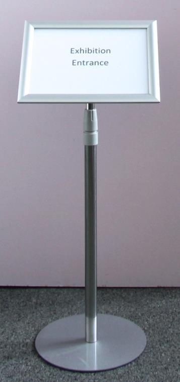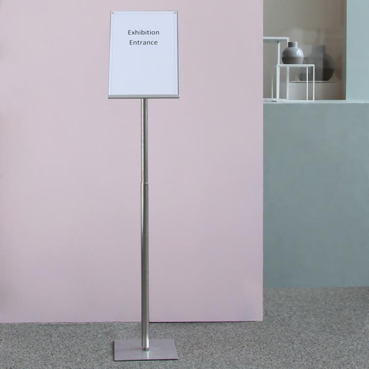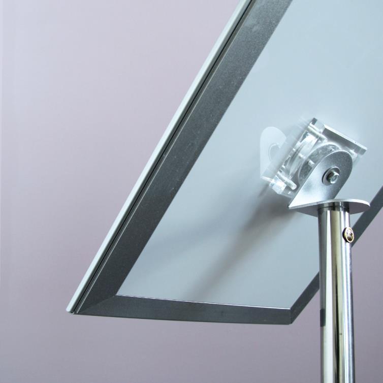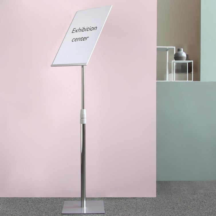 Stijlvolle vloerstandaard waarbij de informatie aan 3 zijden ingesloten wordt door metalen randen en afgedekt wordt met een magnetisch hechtende acrylplaat. Je kunt de buis in hoogte verstellen.