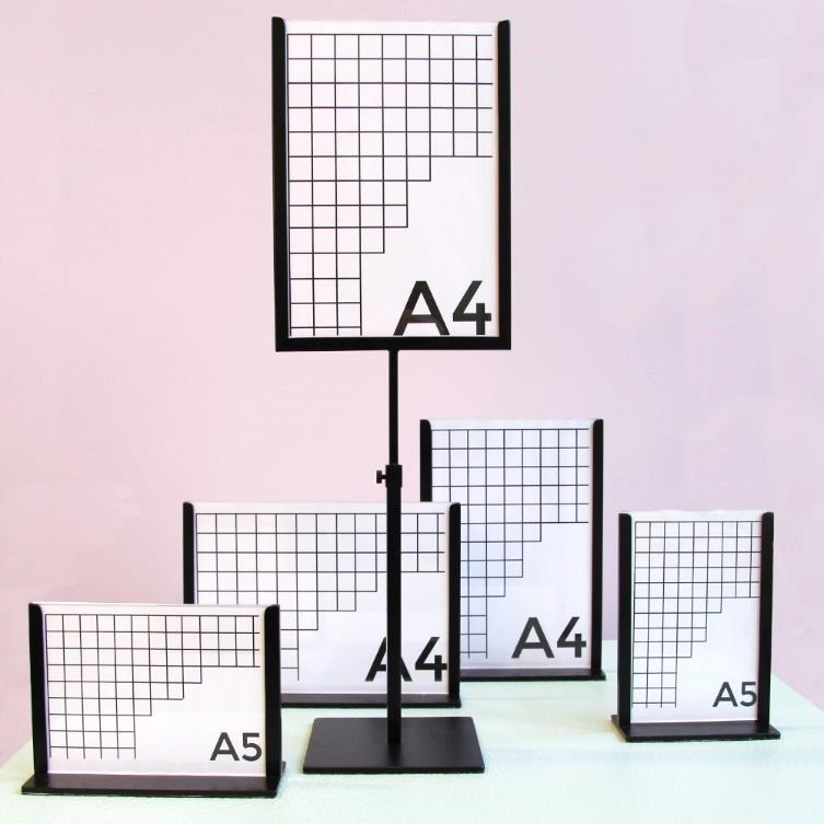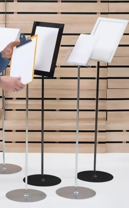 De Zoom hebben we speciaal ontworpen voor druk bezochte ruimtes en staat het superstevig. De standaard is traploos in hoogte verstelbaar tot 120 cm. Het tekstbord is zowel liggend als staand op de voet te bevestigen. Je kunt kiezen tussen A4 of A3 formaat.