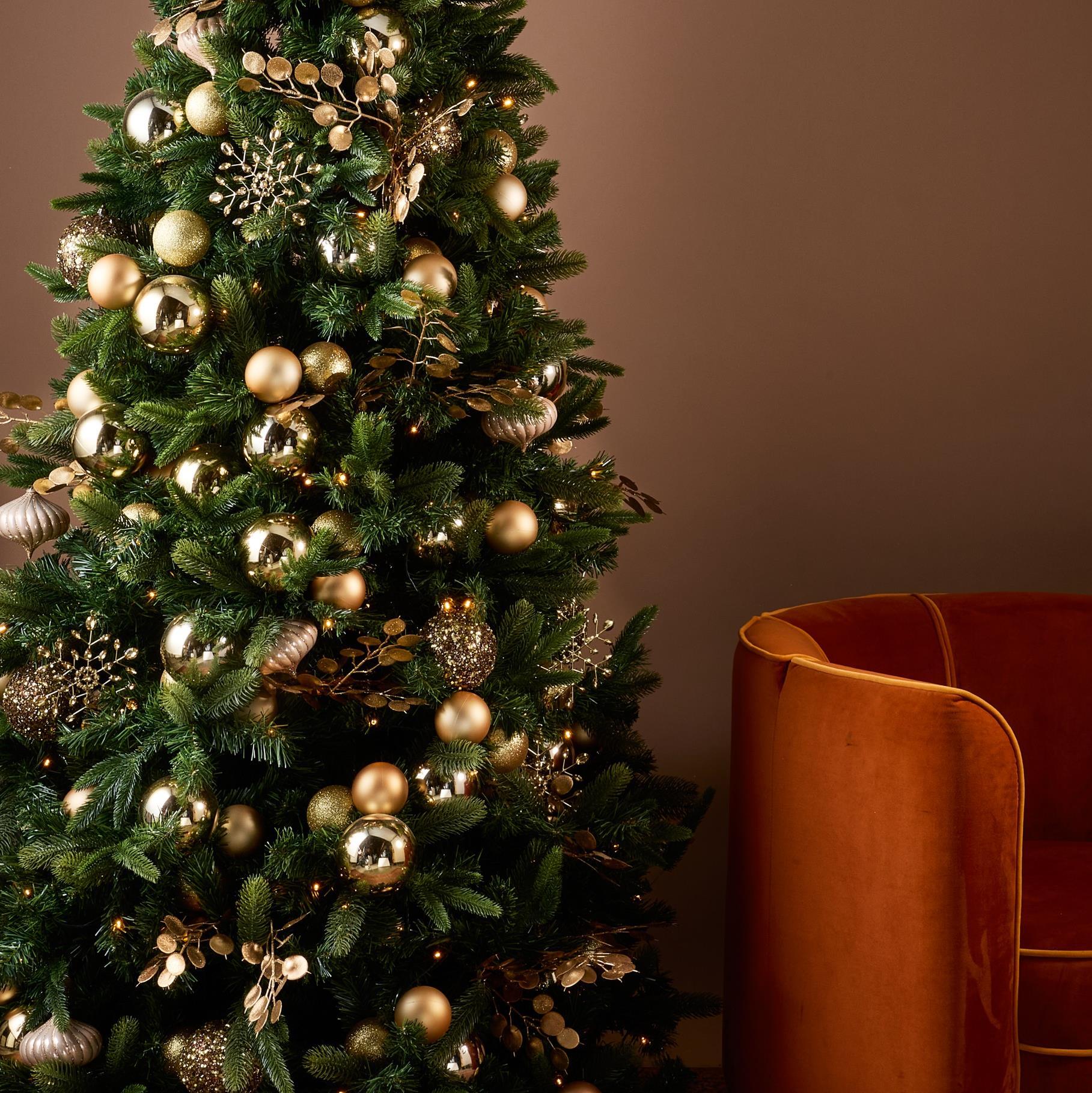 Gedecoreerde kerstboom Delightfull Gold in bak op wieltjes 230cm, geschikt voor outdoor gebruik, geleverd met opberghoes 509,00