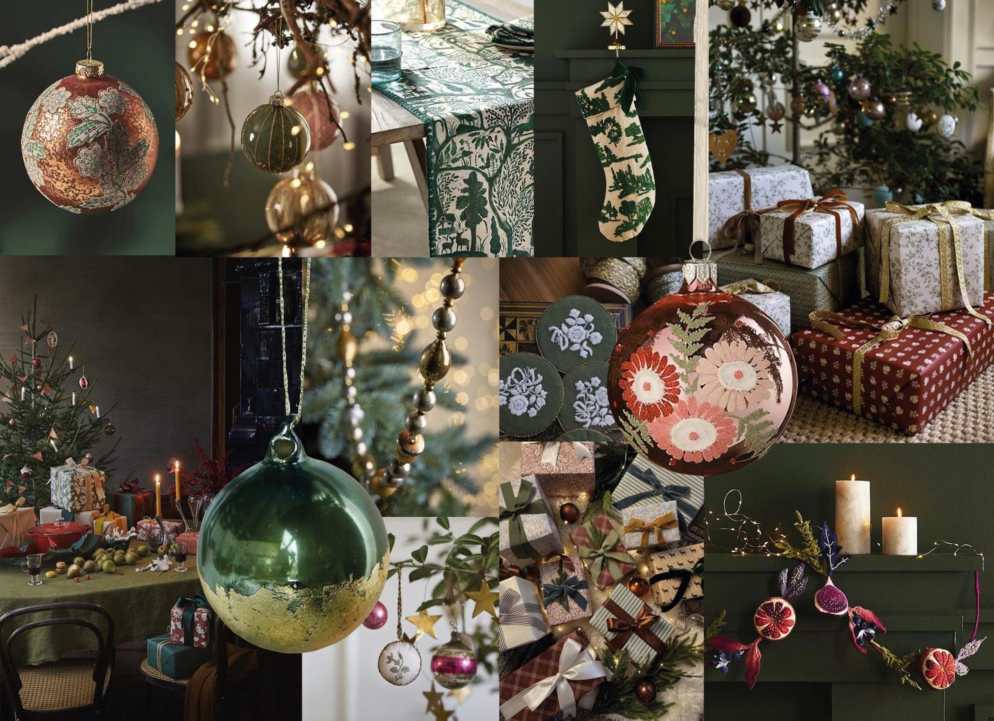 De warme groentinten, die ondersteund worden met een diep warm rood, sieren de ruimte en onder de boom liggen stapels cadeautjes met de meest mooie dessins.
