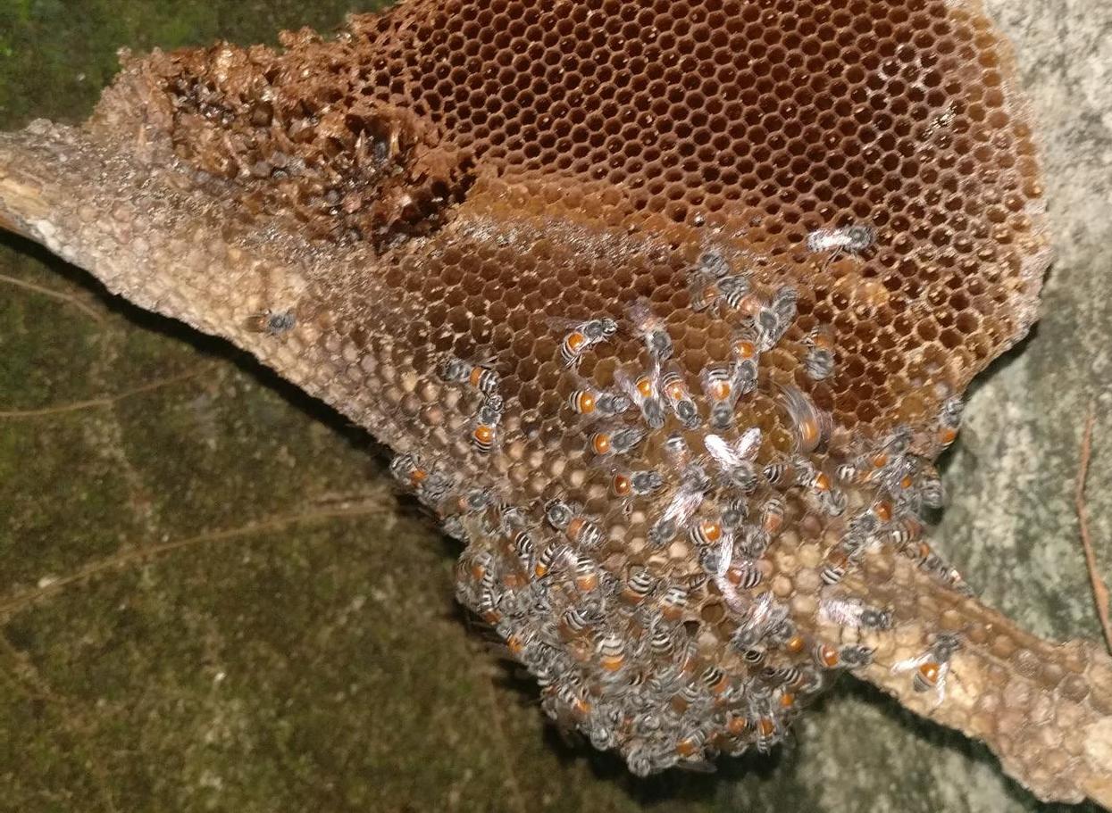 By the time the nest was noticed it was fully developed – the top filled with honey and the brood section was sizeable. On the brood section the bees were holding on to each other and there was little movement. The honeycomb was busy with foraging bees landing, and nurse bees collecting the nectar being delivered to them. The pollen -bees were finding their way to the comb. Within a few days I observed a small black bee – a predator – entering the nest without attack by the soldier bees. I concluded she was stealing the larvae as a protein diet for her grubs. I am still not sure about her identity – maybe Apis andreniformis?