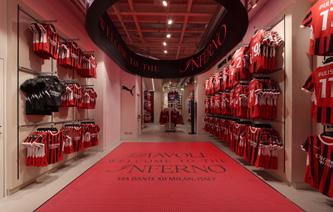 vie più vivaci e vicine alle principali attrazioni di Milano. La posizione, con sei ampie vetrine a catturare l'attenzione dei passanti, renderà lo Store facilmente accessibile sia ai tifosi locali che ai turisti. All'interno, i colori rossoneri si fondono con tonalità chiare per uno stile elegante. Finiture di alta qualità come i pavimenti in legno, eleganti accessori a parete e illuminazione LED integrata conferiscono al negozio un’atmosfera di esclusività, guidando i visitatori attraverso le collezioni sportive, gli articoli di lifestyle e le limited edition. Dettagli distintivi, come le ringhiere della metropolitana, le guglie e gli archi originali ispirati al Duomo completano il negozio e offrono un tocco moderno su dettagli classici, mentre i riferimenti alle mura del Castello Sforzesco, integrati nelle aree delle casse, evocano la città di Milano e creano un ambiente autentico.