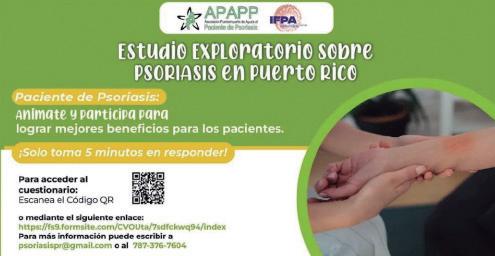 La Asociación Puertorriqueña de Ayuda al Paciente de Psoriasis (APAPP) anuncia el inicio del primer estudio exploratorio sobre la psoriasis en Puerto Rico con el fin de profundizar en la comprensión de esta enfermedad autoinmune crónica que afecta a miles de personas en la isla, y de la cual no existe una base de datos, así como también documentar las necesidades de los pacientes y acceso a tratamientos. ¡Participa!