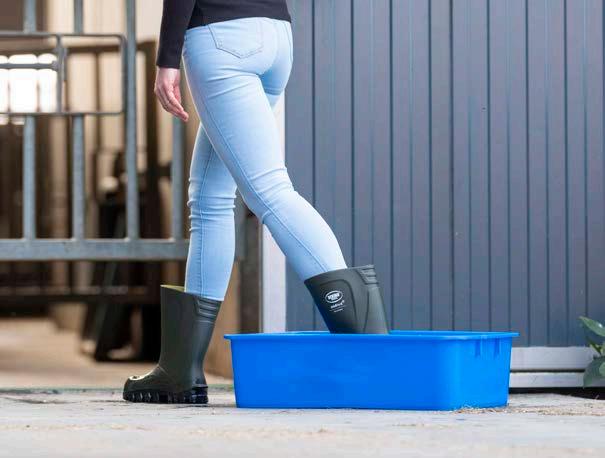 Les chaussures représentent un grand risque de propagation des bactéries, des virus (ex. grippe aviaire...) et d’autres agents pathogènes de l’extérieur vers l’intérieur de l’exploitation, ainsi que de propagation d’un groupe d’animaux à un autre. Vous devez miser sur la biosécurité pour protéger votre cheptel et réduire l’utilisation d’antimicrobiens. Dans la mesure où les chaussures jouent un rôle majeur, il est conseillé d’utiliser des bottes différentes pour chaque zone afin d’empêcher la propagation des agents pathogènes d’un groupe à l’autre.