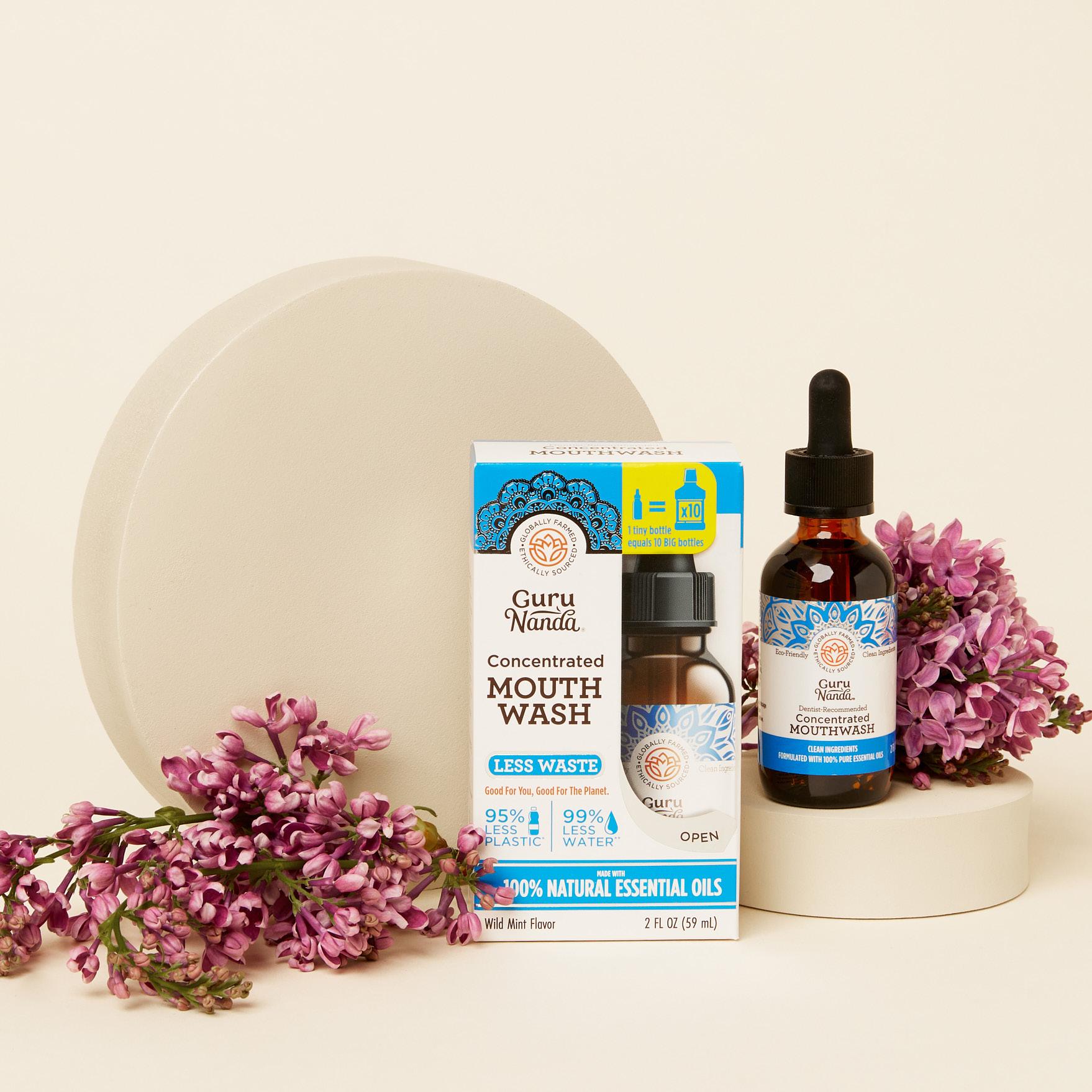 GuruNanda™ is a line of exquisite oils and diffusers designed to improve your health and well-being, and the Concentrated Mouthwash in your box is something special. Its essential oils have been carefully developed through a farm-toshelf process. Just this single 2-ounce bottles is equal to ten 16-ounce regular mouthwash bottles, which helps us to reduce waste and use less water!