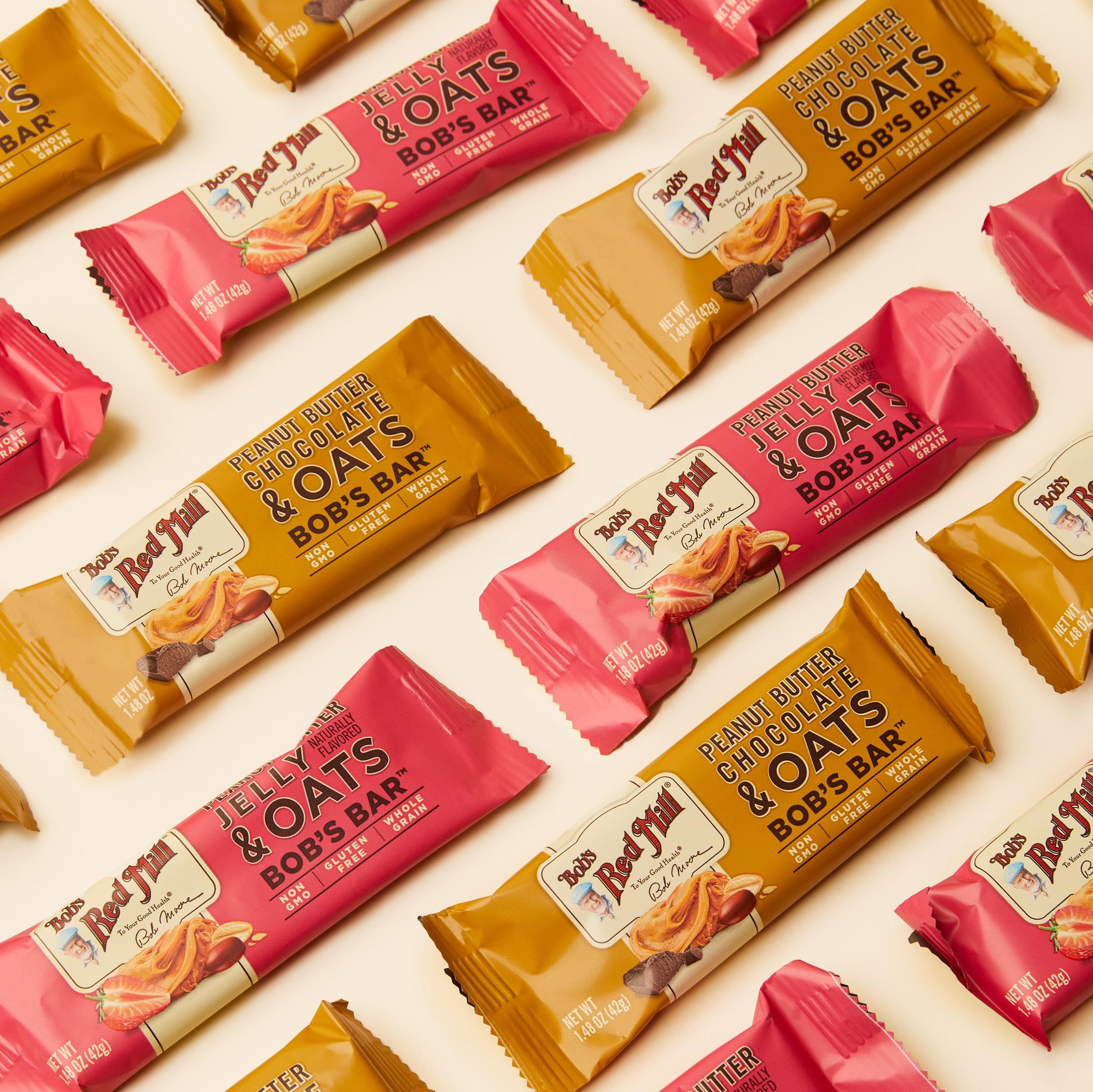 A 5-PACK OF BOB’S BARS IN 1 OF 2 FLAVORS: PEANUT BUTTER & CHOCOLATE OATS OR PEANUT BUTTER & JELLY OATS