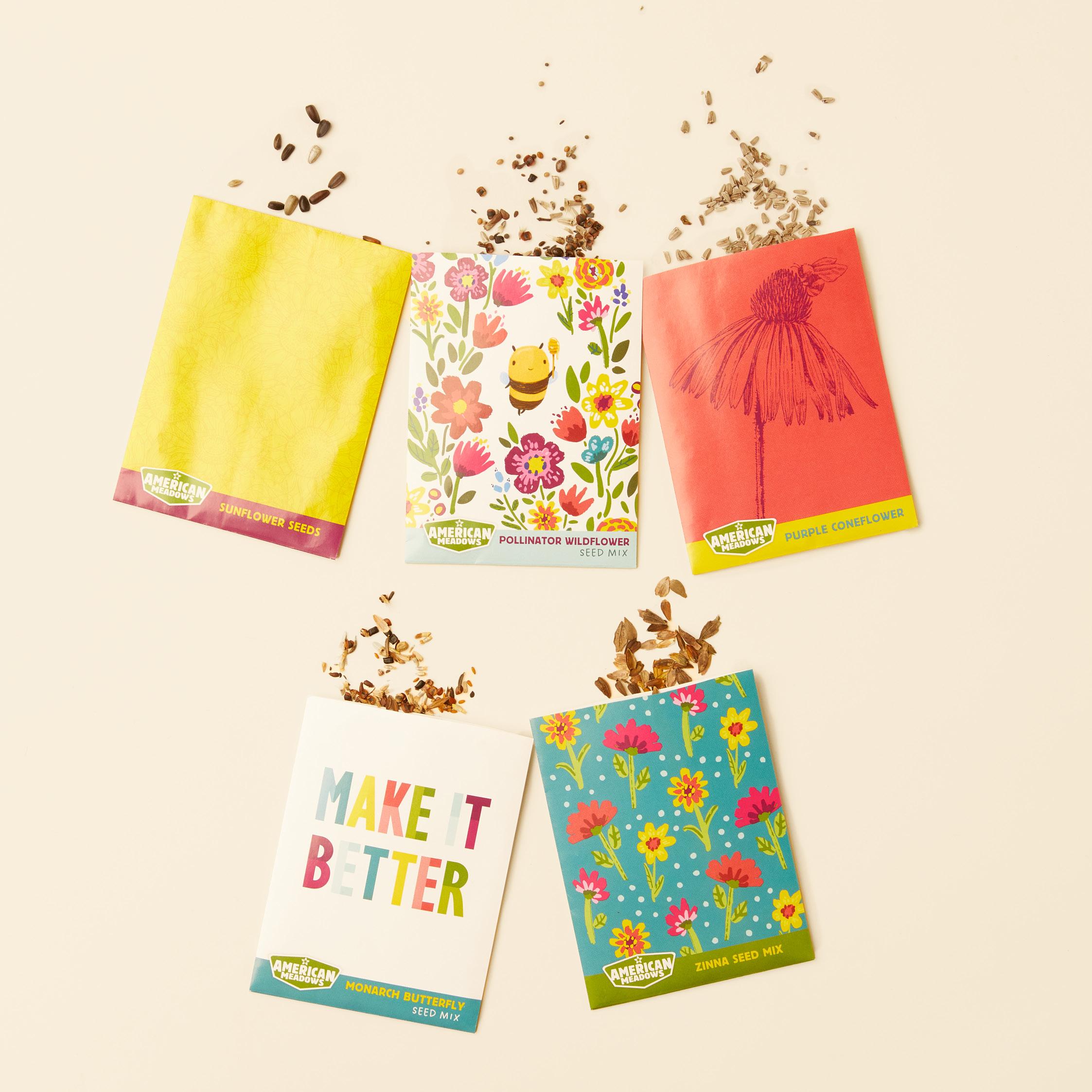 In your box, you will receive a Meadowscaping Seed Starter Kit. This includes 5 packets of pure wildflower seeds and a guide to getting started. Your kit contains two exclusive mixes