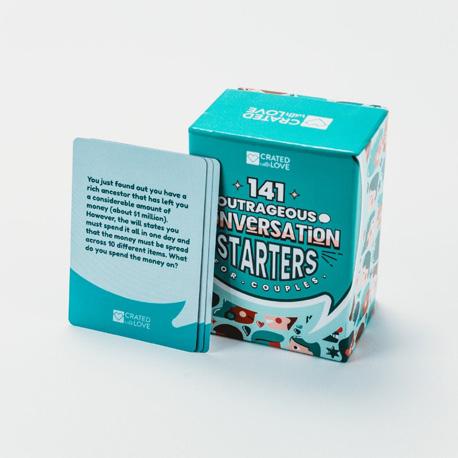 SPICE UP YOUR NEXT DATE NIGHT WITH CRATED WITH LOVE’S OUTRAGEOUS CONVERSATION CARDS. WITH 141 UNIQUE OFF-THE-WALL TOPICS, YOU AND YOUR PARTNER WILL HAVE PLENTY TO TALK ABOUT AND SHARE SOME LAUGHS.