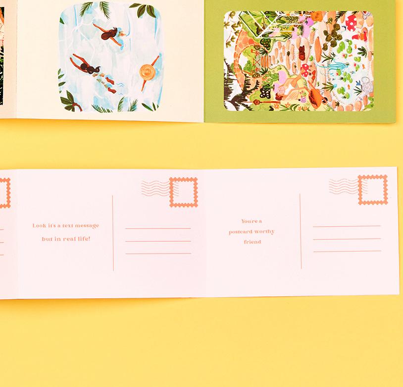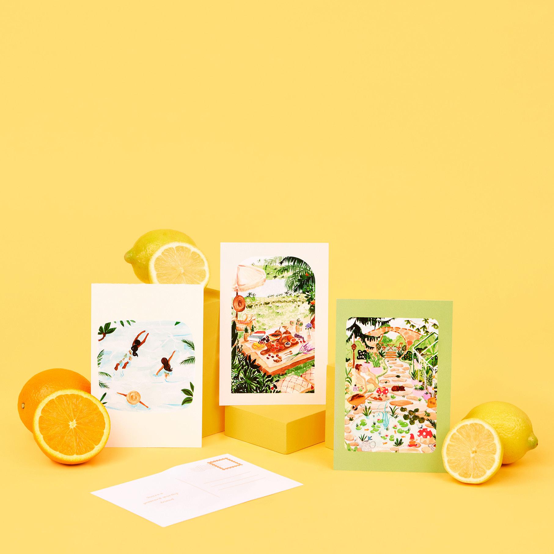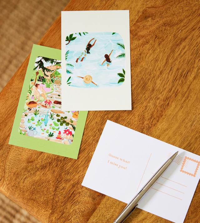 With this set of postcards, it’s as easy as jotting down a quick note and sending them on their way. These beautiful cards, created by our incredibly talented summer box artist Sabina Fenn (who you’ll meet with just a flip of this page), can also be used by their recipients as wall art with a simple frame.
