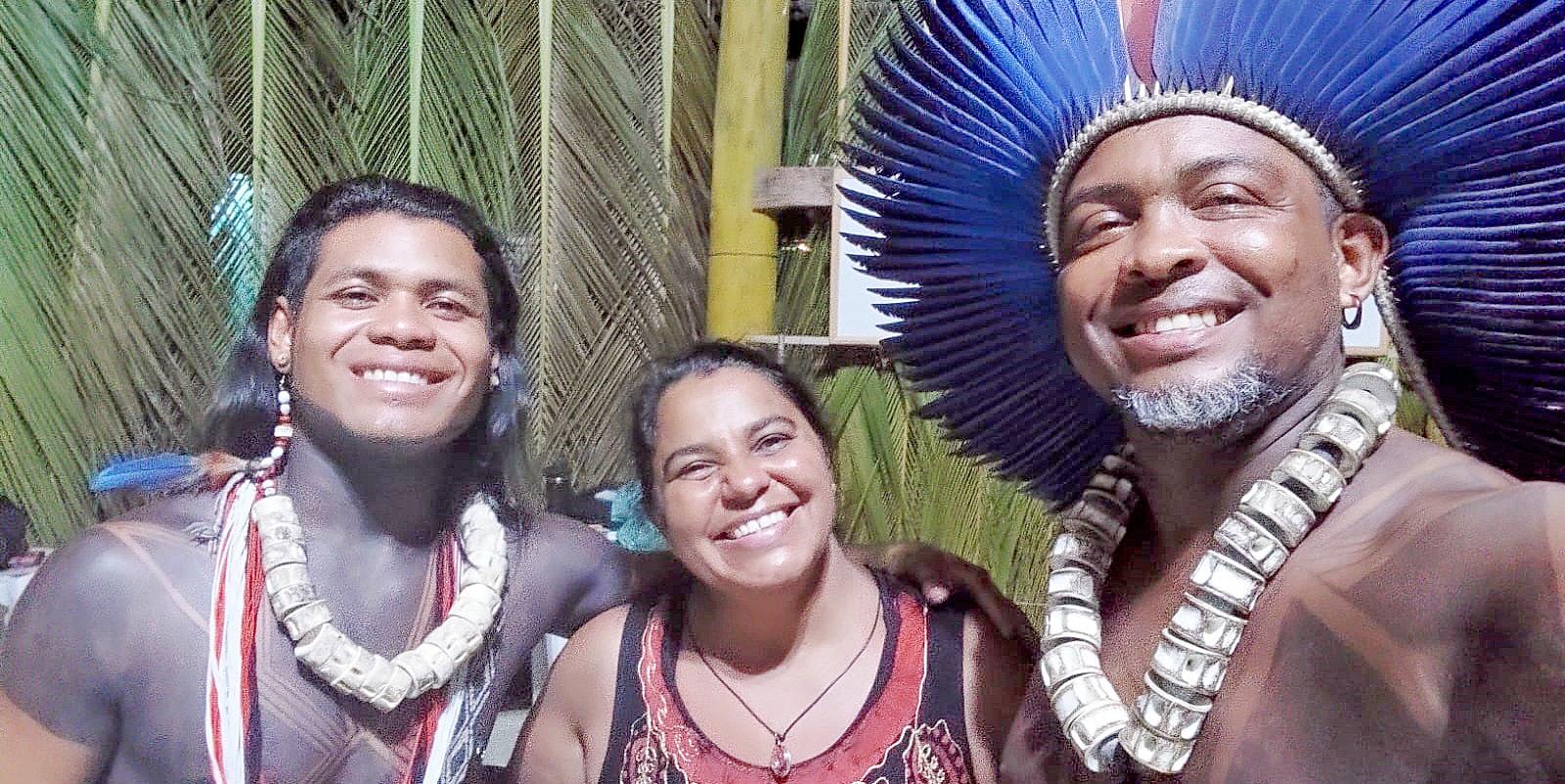 A guia Sandra ao lado da esposa de Txymbyha, cacique Zeca Pataxó, vice-cacique Txymbyha e amigo