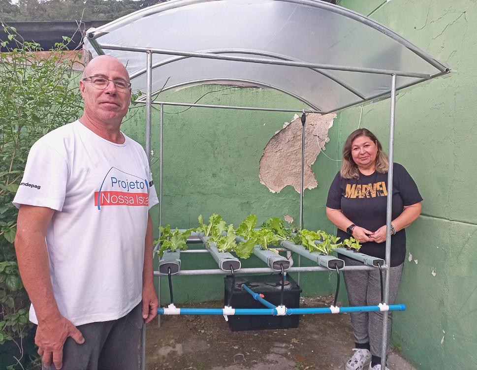Associados da Colônia Z-4 Marcia da Silva Alves, Kleber Ferreira Branco, a presidente Maria Aparecida Nobre e o zootecnista Eduardo Sanches mostram o resultado do plantio em aquaponia que é parte do curso Nossa Isca. Pág 4