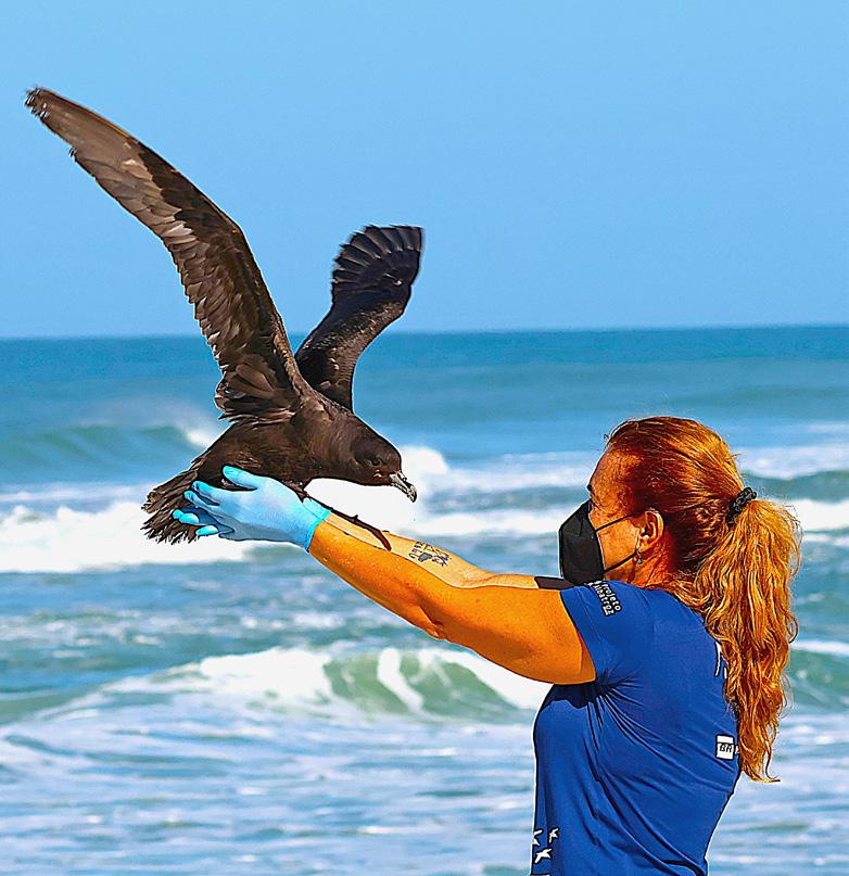 Tatiana Neves do Projeto Albatroz devolve à natureza uma pardela-preta. Pág 7