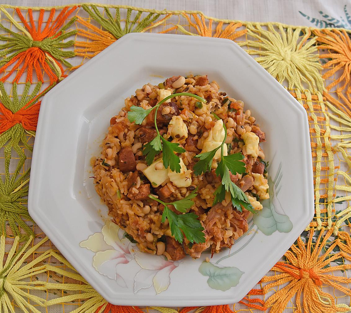 Deixar feijão fradinho de molho na água por 2 horas. Escorrer e ferver por 15 minutos em panela comum. Coar e reservar. Tirar excesso de gordura do bacon e da costelinha. Deixar a carne seca e a costelinha de porco de molho na água misturada a 1 xícara (chá) de açúcar por 2 horas. Retirar da água, colocar num recipiente e jogar água fervente para tirar excesso de gordura. Deixar 10 minutos e escorrer. Desfiar a carne seca e cortar a costelinha em pedaços grandes, deixando os ossos. Cortar a linguiça calabresa em rodelas. Refogar numa panela grande o bacon até dourar. Acrescentar a linguiça, a costelinha de porco e a carne seca desfiada. Deixar dourar bem. Acrescentar a cebola e o alho picados. Mexer bem. Acrescentar o tomate e o pimentão picados. Colocar o feijão cozido e o arroz com um pouco de água e deixar no fogo até o arroz cozinhar. Acrescentar salsinha. Colocar o queijo coalho picado e tampar até derreter. Colocar numa travessa e enfeitar com pimenta dedo-de-moça. Bom apetite!