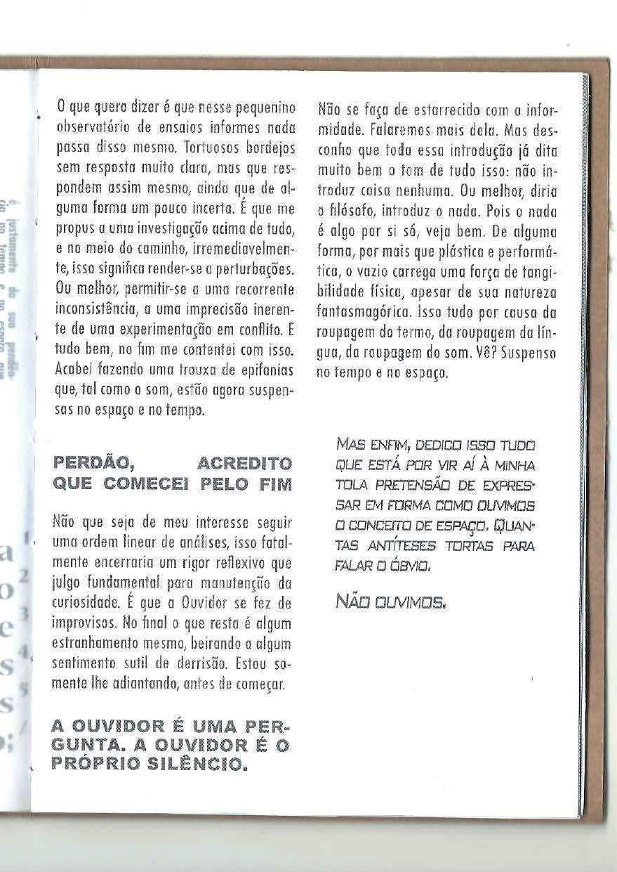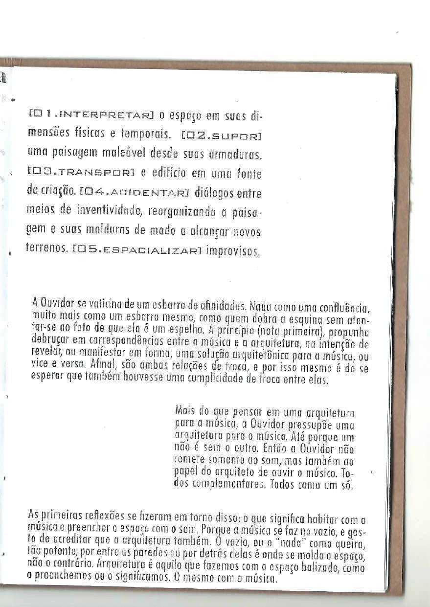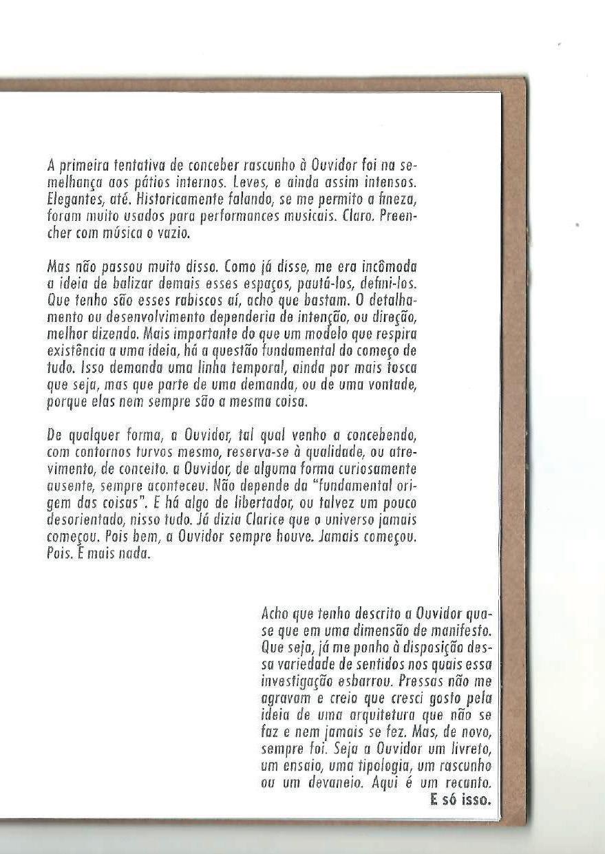 Ouvidor é uma investigação do que é, ou o que deveria ser, a arquitetura. Antes mesmo do projeto em si, é uma reflexão do entendimento do espaço, ainda que com liberdades poéticas. Uma investigação da arquitetura do informe e suas experimentações, esboços e acidentes.