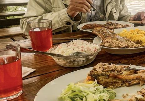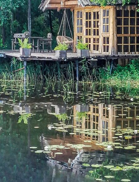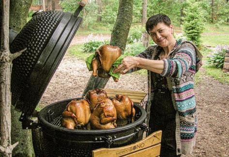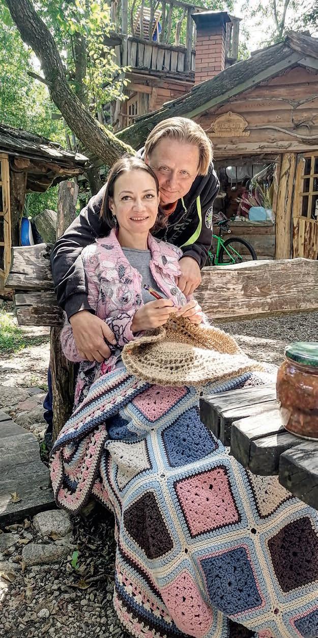 would become his main activity. Even then there were very few estates, and doubts overcame whether he could, whether the first visitors would like it here... They came from Moscow. They left delighted with what they saw. It was a good push to start slowly turning around. He took out a loan. So gradually they turned around. The style of the house in which Aleksandr lives with his family is ‘polished slab’. He was very afraid of disturbing the natural landscape, he strove to save the trees without damaging the root system. And here is what Aleksandr says about his wife, “Lena is the face of the estate, a real hospitable hostess. We’ve been together for five years now. She supports me in all endeavours. With her needlework, Lena brought beauty and aesthetics to the Reserved Island. In addition, she greatly unloaded me with the acceptance of orders, the execution of contracts. I can devote more time to organisational work, infrastructure, constant negotiations. She is an excellent craftswoman. She also taught Irina Serafimovich, Yakov’s wife, how to weave hanging chairs, free of charge. And she is happy because this creative occupation, from which she has an income, has diversified her peasant work in the household. And Lena is also engaged in gardening. Greenhouses with tomatoes are also hers... Many guests have become our friends. They also come here because, as they say, they love us together, they love our couple.”