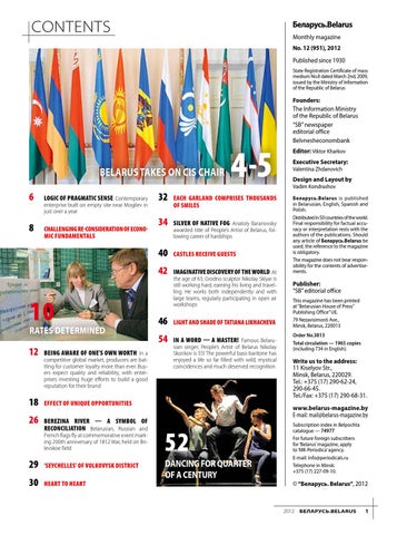 Беларусь.Belarus Monthly magazine No. 12 (951), 2012 Published since 1930 State Registration Certificate of mass medium No.8 dated March 2nd, 2009, issued by the Ministry of Information of the Republic of Belarus