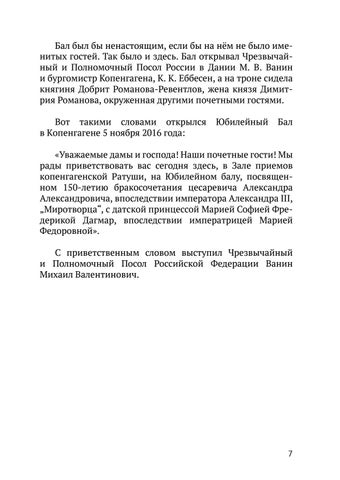 «Уважаемые дамы и господа! Наши почетные гости! Мы рады приветствовать вас сегодня здесь, в Зале приемов копенгагенской Ратуши, на Юбилейном балу, посвященном 150-летию бракосочетания цесаревича Александра Александровича, впоследствии императора Александра III, „Миротворца“, с датской принцессой Марией Софией Фредерикой Дагмар, впоследствии императрицей Марией Федоровной». С приветственным словом выступил Чрезвычайный и Полномочный Посол Российской Федерации Ванин Михаил Валентинович.