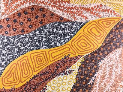 Reflections of Country is inspired by Kayannie’s dual connections to Central Australia and Cape York Her vibrant, colourful art explores the rainforest, beaches and rivers of Far North Queensland and the stunning deserts of her Luritja heritage.