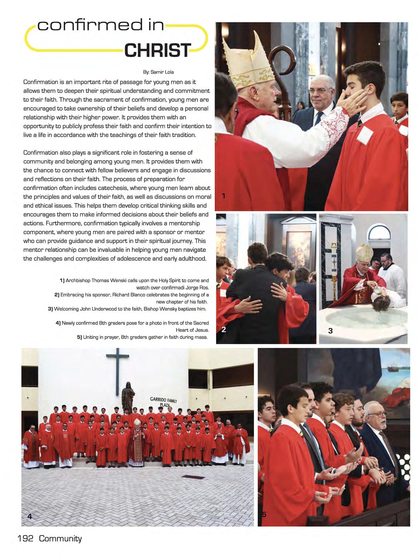 Bottom Right: Digging deeper into his faith, sixth grader Kevin Gonzalez and Deacon Robert D' Malley talk about ways to find God in school life.