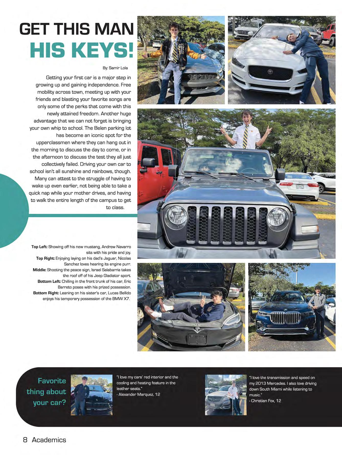 Getting your first car is a major step in growing up and gaining independence. Free mobility across town, meeting up with your friends and blasting your favorite songs are only some of the perks that come with this newly attained freedom. Another huge advantage that we can not forget is bringing your own whip to school. The Belen parking lot has become an iconic spot for the upperclassmen where they can hang out in the morning to discuss the day to come, or in the a~ernoon to discuss the test they all just collectively failed. Driving your own car to school isn't all sunshine and rainbows, though. Many can attest to the struggle of having to wake up even earlier, not being able to take a quick nap while your mother drives, and having to walk the entire length of the campus to get to class.