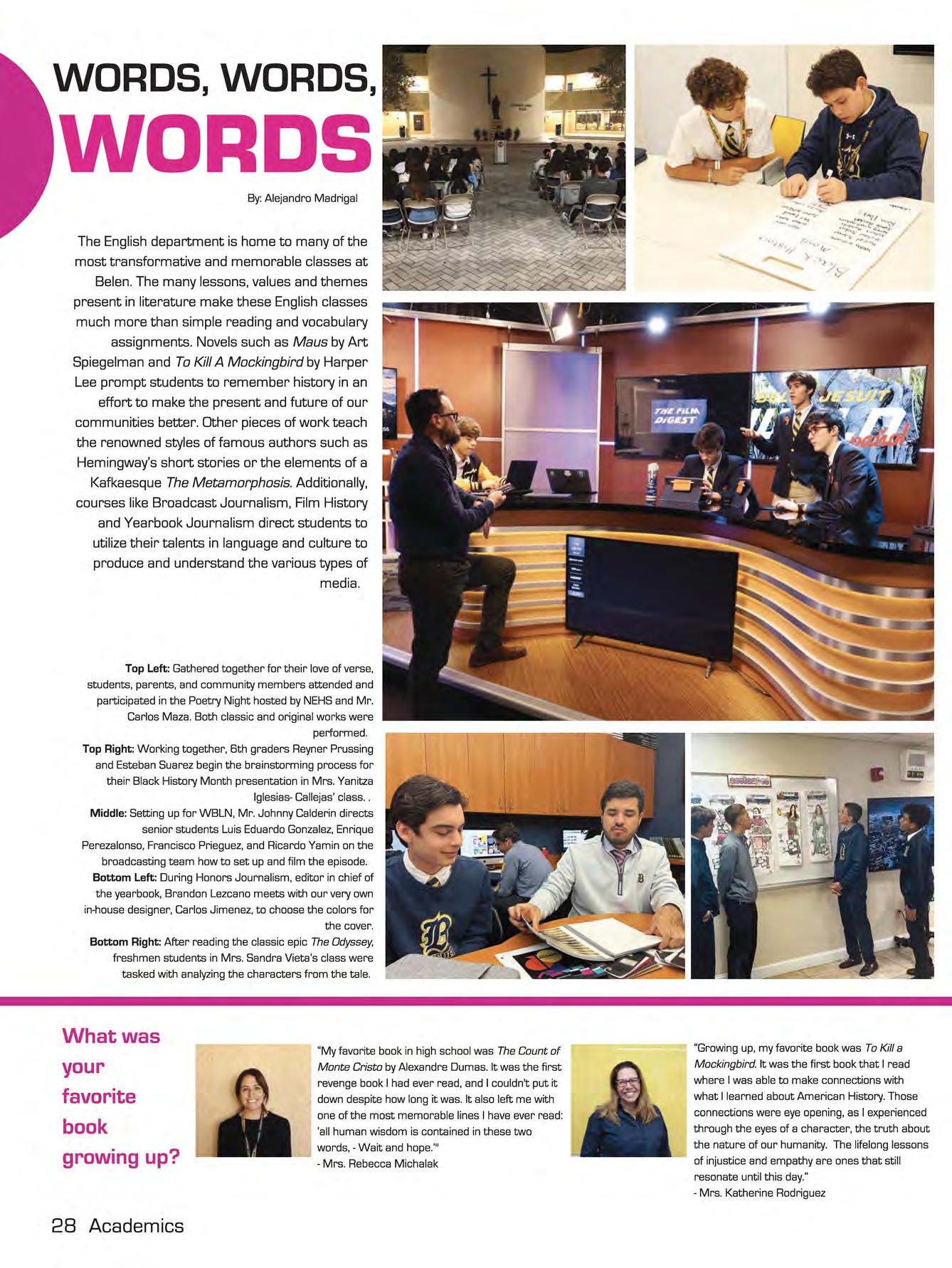 The English department is home to many of the most transformative and memorable classes at Belen. The many lessons, values and themes present in literature make these English classes much more than simple reading and vocabulary assignments. Novels such as Maus by Art Spiegelman and To Kill A Mockingbird by Harper Lee prompt students to remember history in an effort to make the present and future of our communities better. Other pieces of work teach the renowned styles of famous authors such as Hemingway's short stories or the elements of a Kafkaesque The Metamorphosis. Additionally, courses like Broadcast Journalism, Film History and Yearbook Journalism direct students to utilize their talents in language and culture to produce and understand the various types of media.