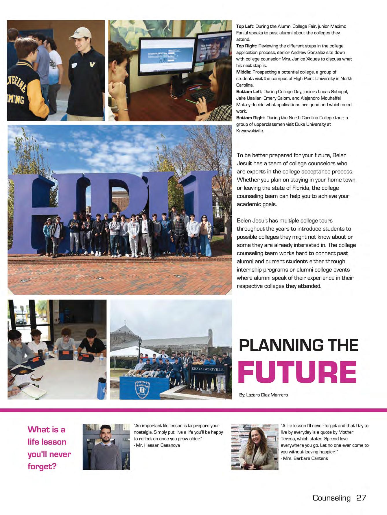 Belen Jesuit has multiple college tours throughout the years to introduce students to possible colleges they might not know about or some they are already interested in. The college counseling team works hard to connect past alumni and current students either through internship programs or alumni college events where alumni speak of their experience in their respective colleges they attended.