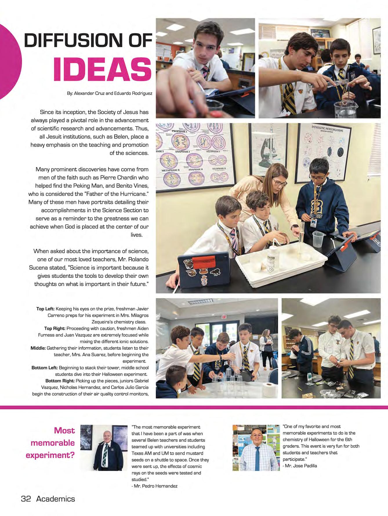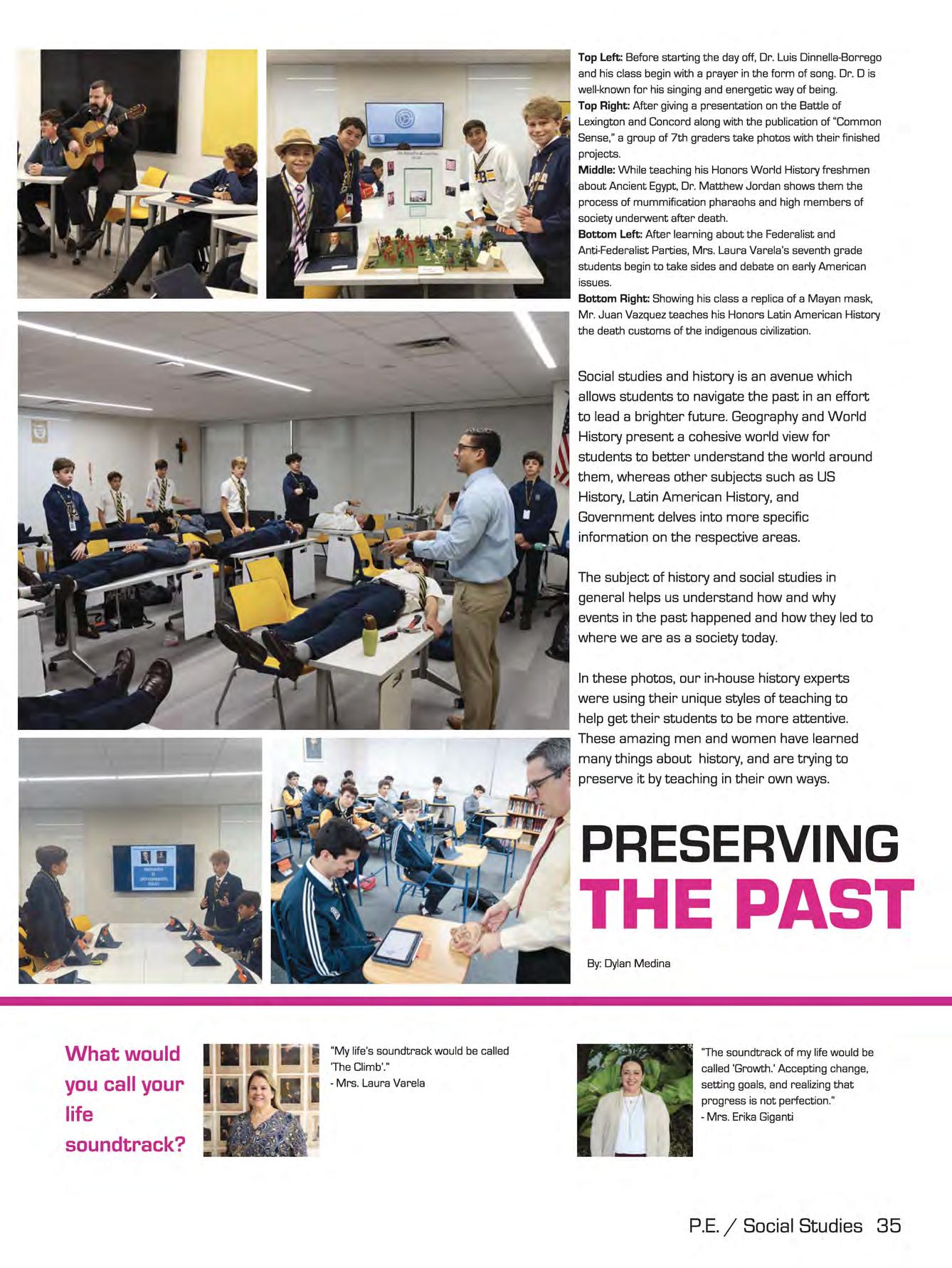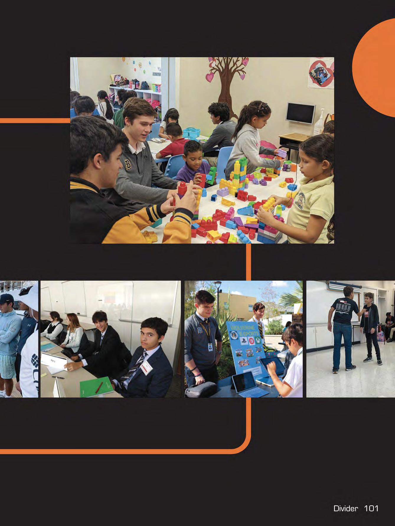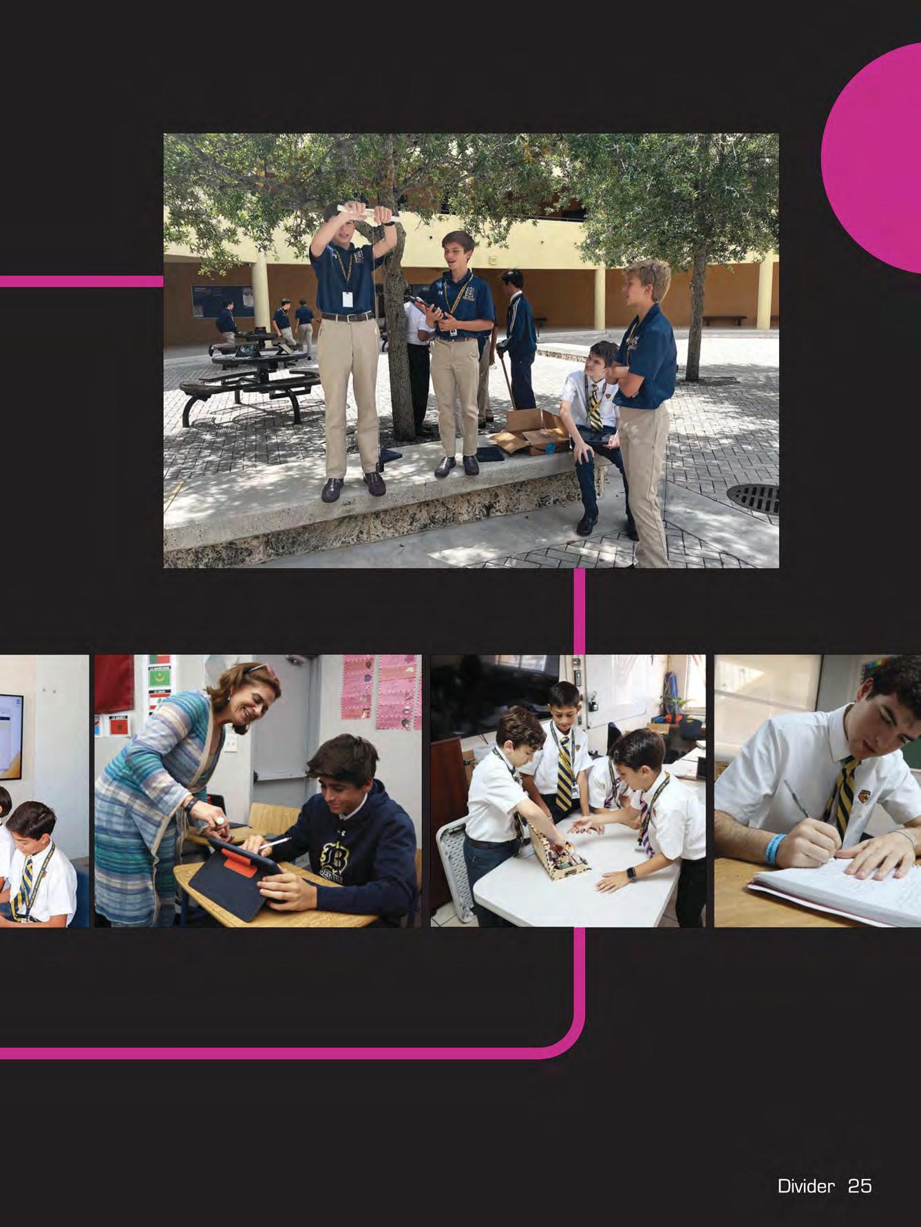 Top Right: Working together, 6th graders Reyner Prussing and Esteban Suarez begin the brainstorming process for their Black History Month presentation in Mrs. Yanitza Iglesias-Callejas' class .. Middle: Setting up for WBLN, Mr. Johnny Calderin directs senior students Luis Eduardo Gonzalez, Enrique Perezalonso, Francisco Prieguez, and Ricardo Yamin on the broadcasting team how to set up and film the episode.