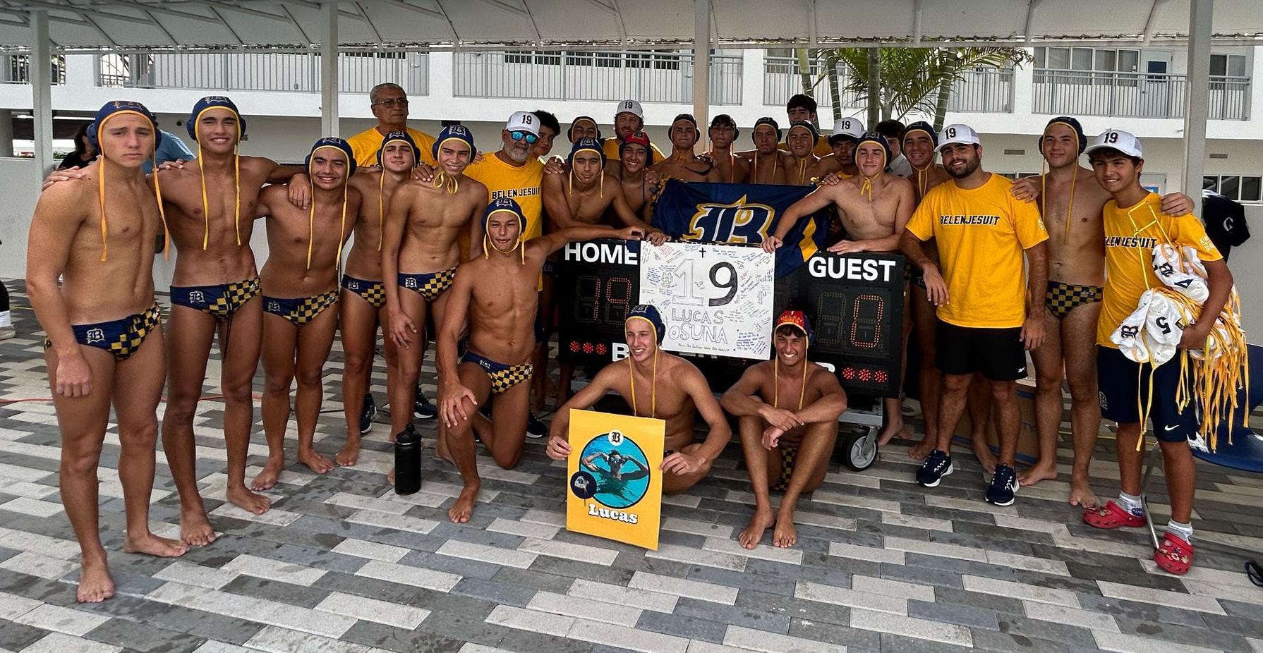 In addition, we gather tonight to celebrate our faith. It is a faith that sustains us and gives us the courage and strength to press on no matter what the circumstances. It is faith in ourselves, each other, and, most importantly, in God. At no time was our faith more tested than when this year we lost our brother and fellow athlete Lucas Osuna ’27. Both in the classroom and in the pool, Lucas was a true Belen man, a true friend, and a true brother. While his passing stung more profoundly than any loss on the field, it was our faith that has helped us move forward never forgetting his place in our lives. It is why his water polo cap with the number 19 still hangs proudly on the cross of our swimming pool.