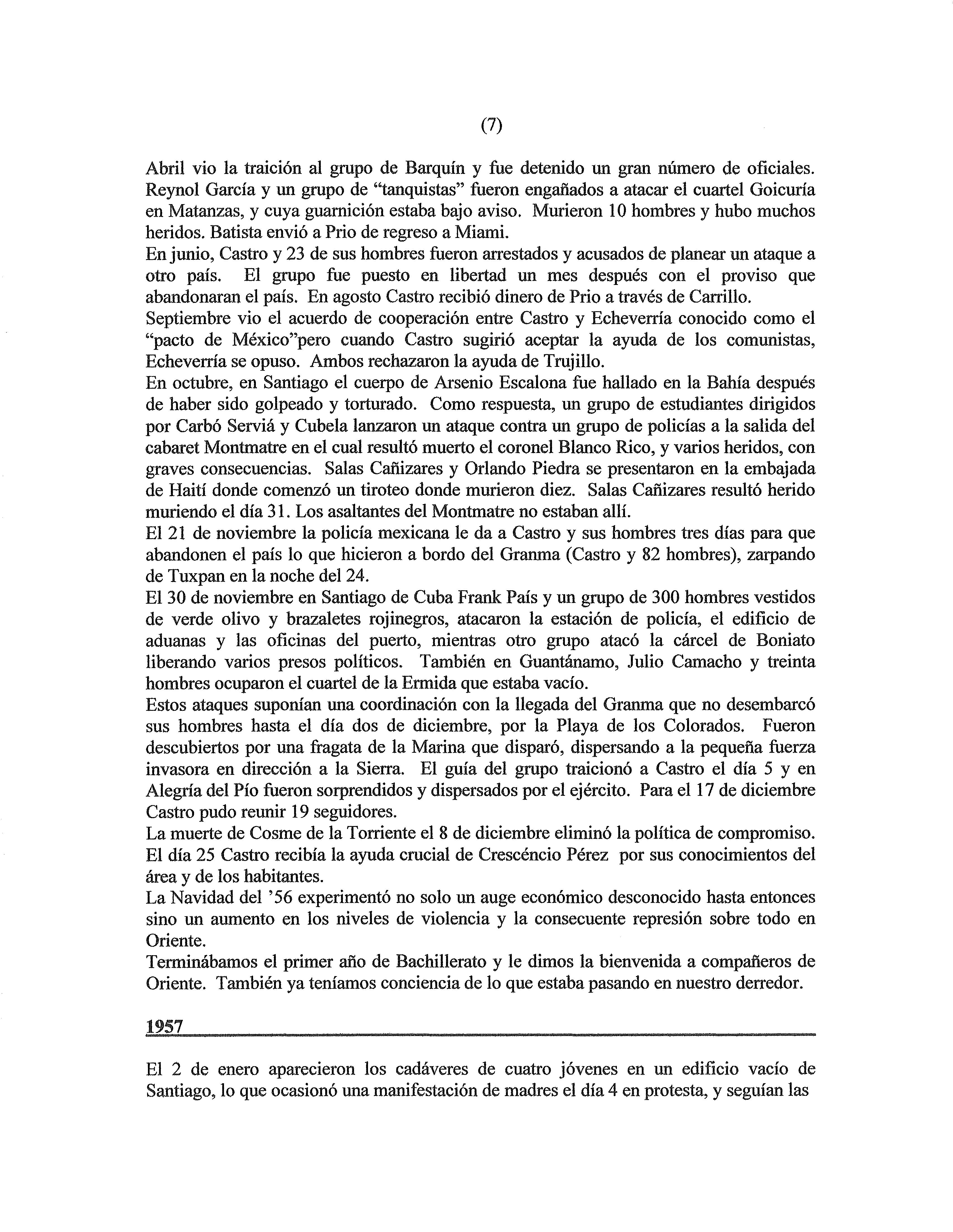 El 5 de septiembre se sublev6 en Cienfuegos parte de la Marina de Guerra (en realidad la conspiraci6n era mas grande incluyendo a La Habana y Mariel, pero estos dos grupos no estaban preparados y nose alzaron) dirigidos por San Roman, que habia sido parte de la · conspiraci6n de Barquin, apoyados por 150 hombres del M-26-7 y por 50 autenticos y se apoderaron de la base y despues de la ciudad. El ataque fue repelido por la infanteria motorizada de Santa Clara y por la aviaci6n. 67 rebeldes se rindieron despues juzgados y Ia mayoria fusilados; otros huyeron como Aragones y Camacho. A San Roman lo cogieron, lo torturaron por unos meses y lo mataron. Batista cometi6 el grave error de usar armas y equipos que habian sido cedidos por EEUU como parte de la defensa hemisferica, no para uso intemo, lo cual enfureci6 a EEUU. En la Sierra ocurrian los encuentros del Hombrito y Palma Mocha. Por las perdidas esta fue la Ultima vez que el ejercito entraria en la Sierra. Y el competente Barrera fue substituido por el incompetente de del Rio Chaviano. Durante septiembre en la Sierra hubo varios pequefios combates. En octubre Radio Oriente fue destruida por bombas. En noviembre se realiz6 en Miami el "Pacto de Miami" entre representantes de la oposici6n ortodoxa, los autenticos, la Direcci6n del M26-7 , la FEU, el Directorio y la oposici6n sindicalista constituyendo un Junta de Liberaci6n. Prio financiaba la mayoria de estos grupos. Castro no habfa sido informado y el 14 de diciembre, despues de la acci6n de Veguitas, la conden6 en una carta que lleg6 a Miami el30 de diciembre. Hacia finales del afio ocurri6 el asesinato del odiado coronel Fermin Cowley en Holguin. Castro todavia no contaba con 300 hombres alzados. 1957 fue el primer afio del segundo periodo presidencial de Eisenhower y las relaciones con Cuba eran generalmente buenas.