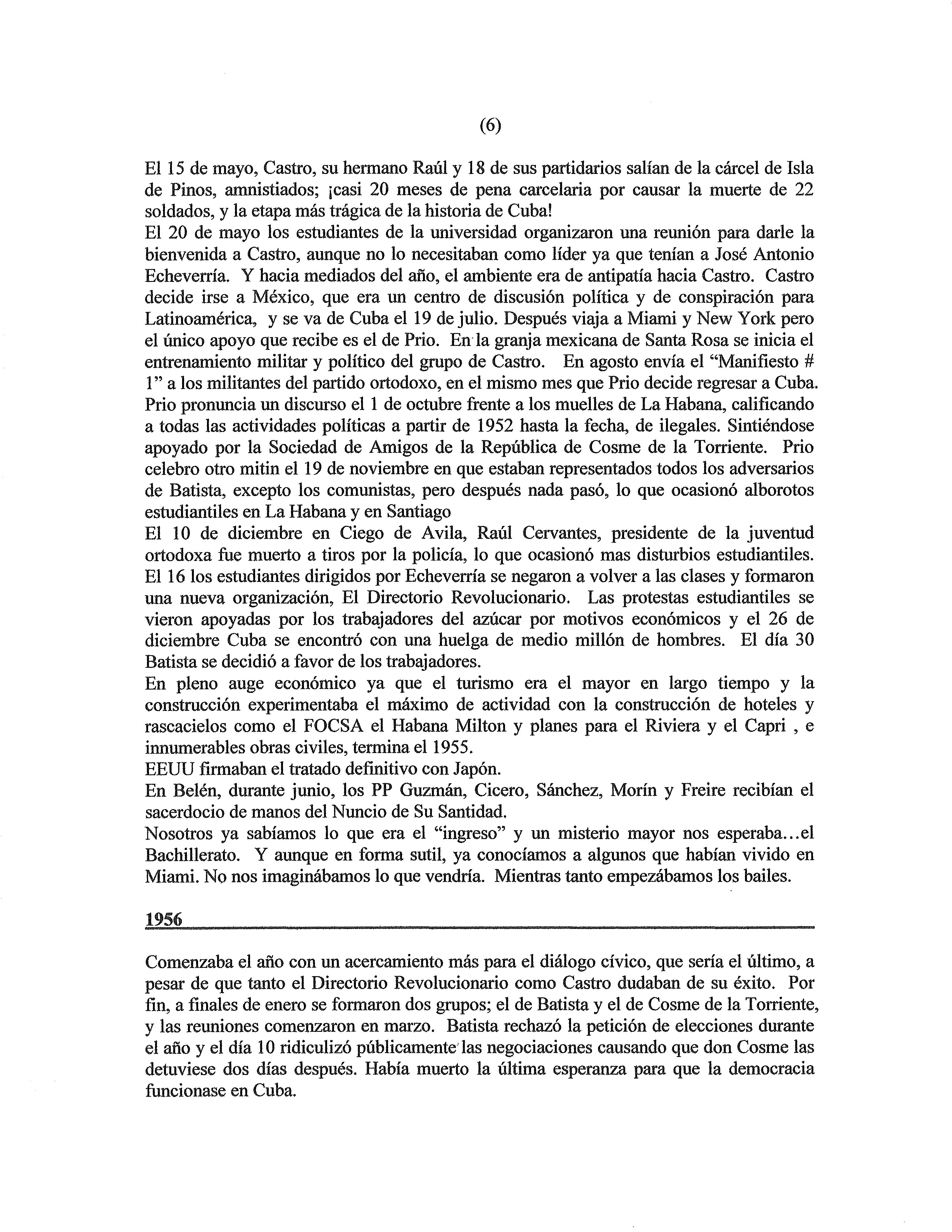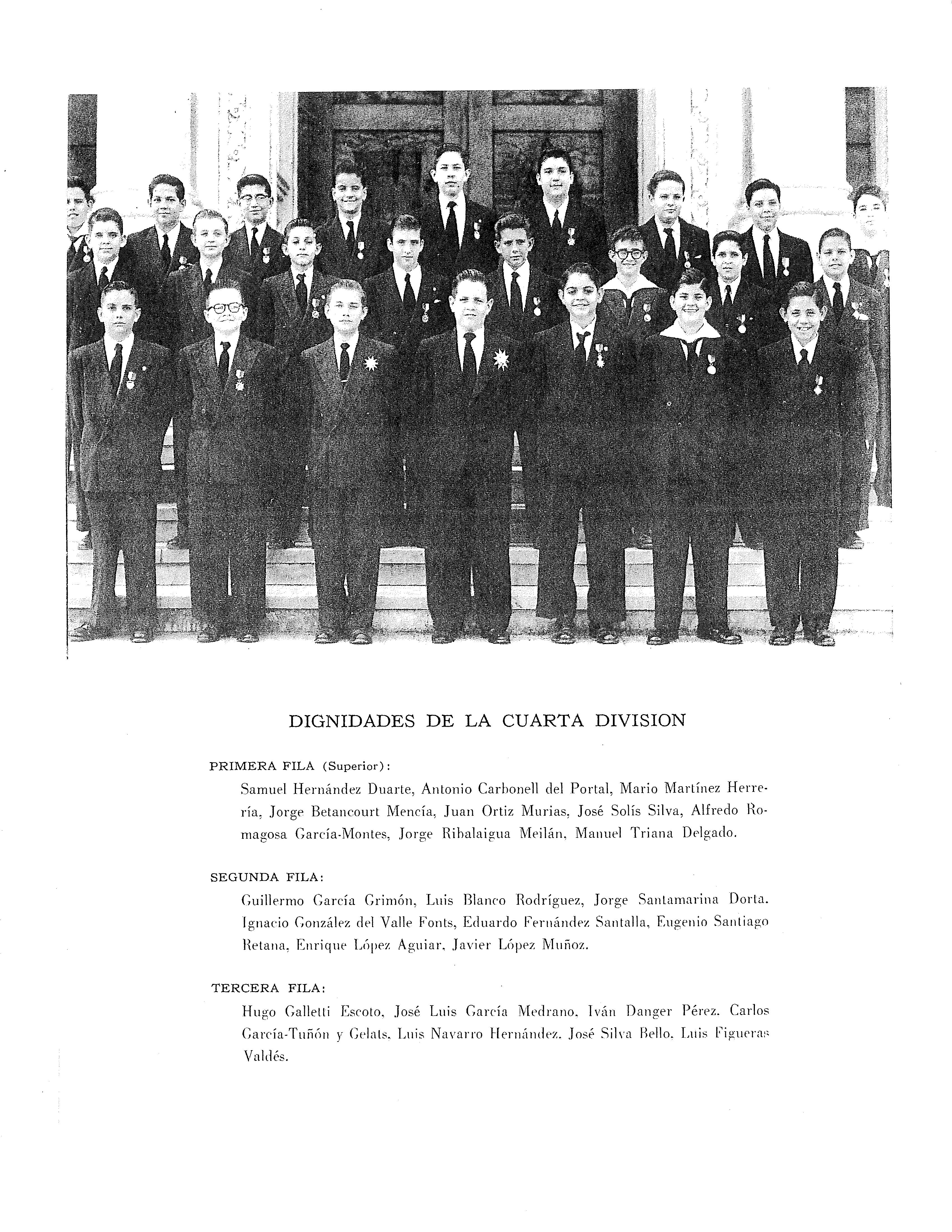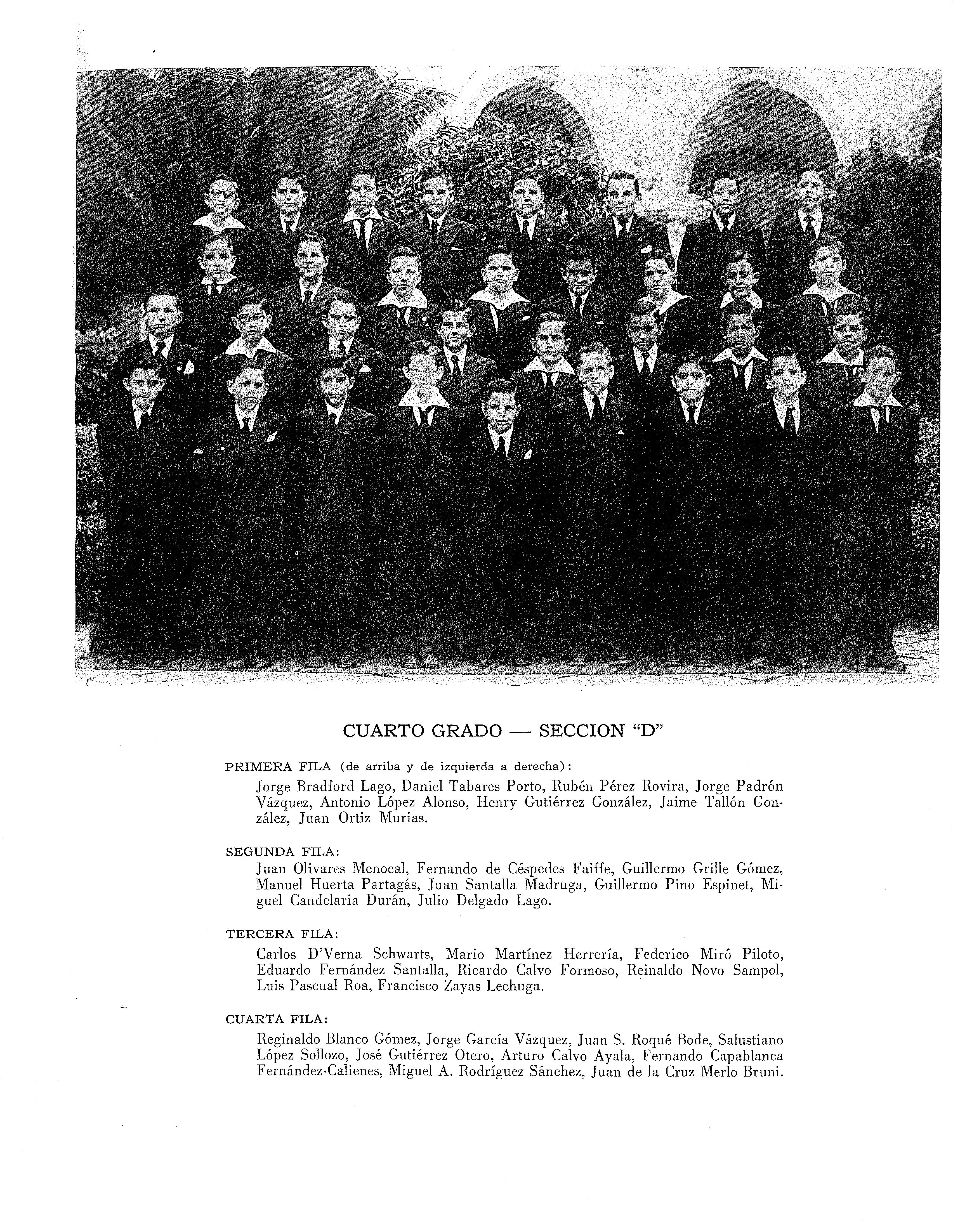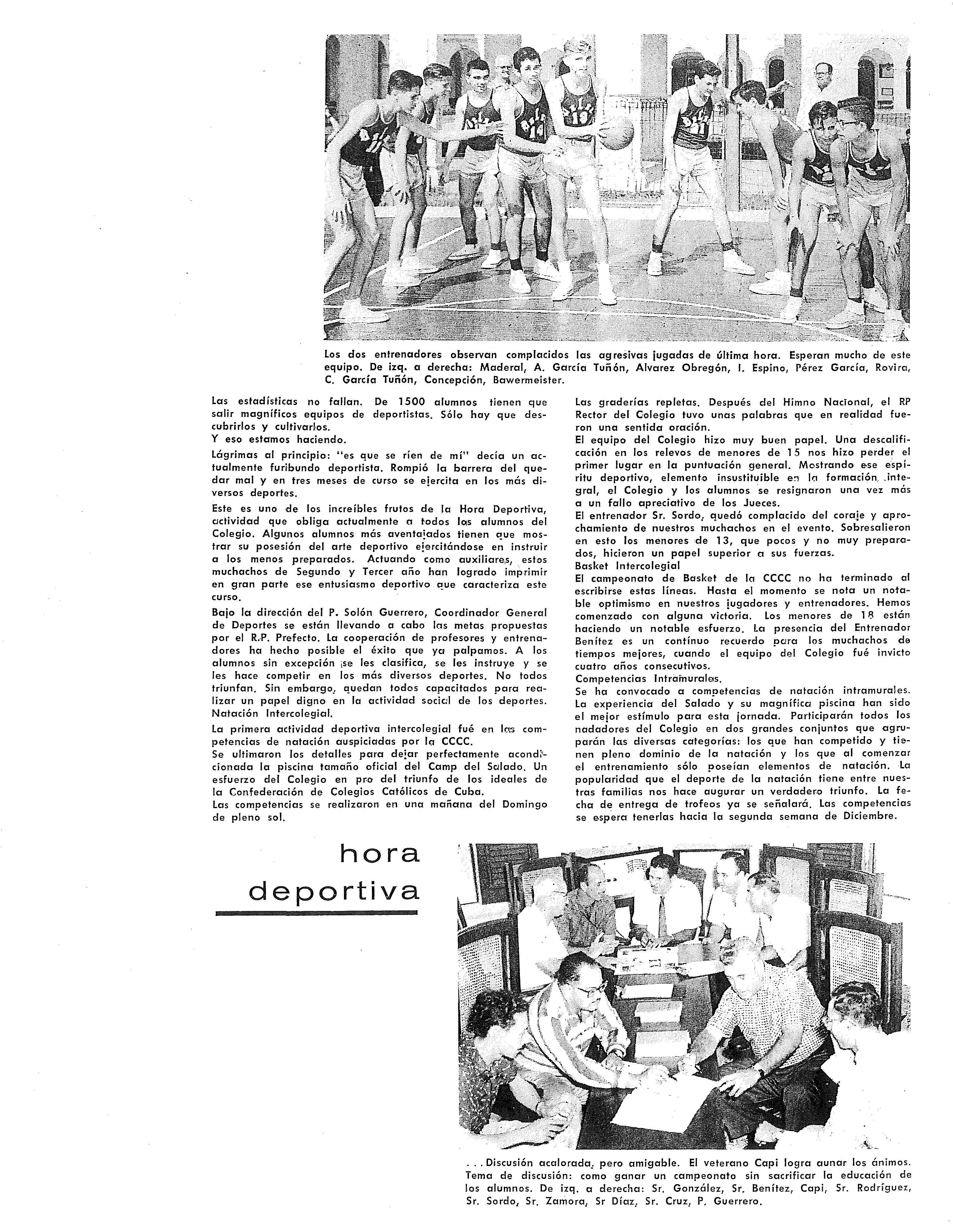 En nuestro colegio se constituye oficialmente la Asociaci6n de Padres de Familia, presidida por el Dr. Manuel Vega Penichet. El Ministerio de Educaci6n aprueba la erecci6n de la Universidad Cat6lica de Belen con las facultades de Humanidades, Ingenieria y Medicina y Ia Compafiia de Jesus entrega el Colegio de Sagua la Grande a los Misioneros de los Sagrados Corazones. En Belen empezaron las clases con 1450 alumnos. Se fund6 el campamento de verano de El Salado. Nosotros ya pasabamos el segundo afio de Bachillerato y notabamos que ya empezaban a faltar ciertos alumnos y llegaban otros de fuera de La Habana; leiamos las noticias y las discutiamos, a veces inocentemente. Cada vez mas nos atraia las formas de vestir, la musica, los autos, siempre mirando al futuro. Ya eramos adolescentes, menos nifios. Y alguno que otro nos creiamos ya hombres.