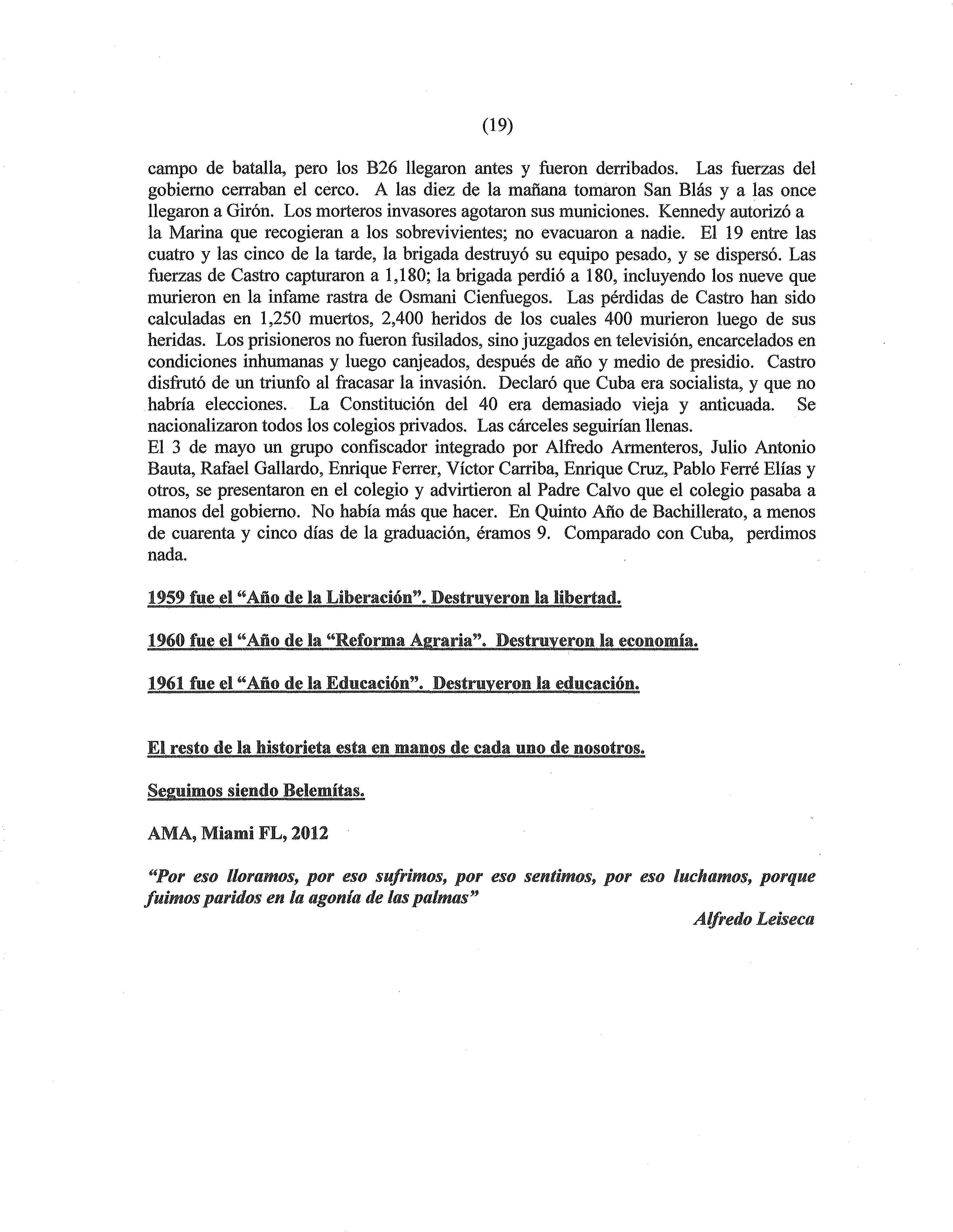 Race varias semanas complete el "registration" para asistir con mi esposa a la comida del Sabado 4 de Junio en el Hotel Sofitel donde todos vamos a celebrar 50 afios de nuestra experiencia Belemita. Me daba mucho gusto pensar que podria saludar a muchos de aquellos compafieros con los que comparti tantos afios de nifiez y adolescencia y de los que tengo tantos gratos y entrafiables recuerdos, pero especialmente a aquellos que no he podido ver desde que sali de Cuba. Desafortunadamente, esto no va a ser posible. Razones de salud me impiden asistir. El hombre propone y Dios dispone, dice el viejo refran, y cabe afiadir, simplemente, jBendito sea Dios!