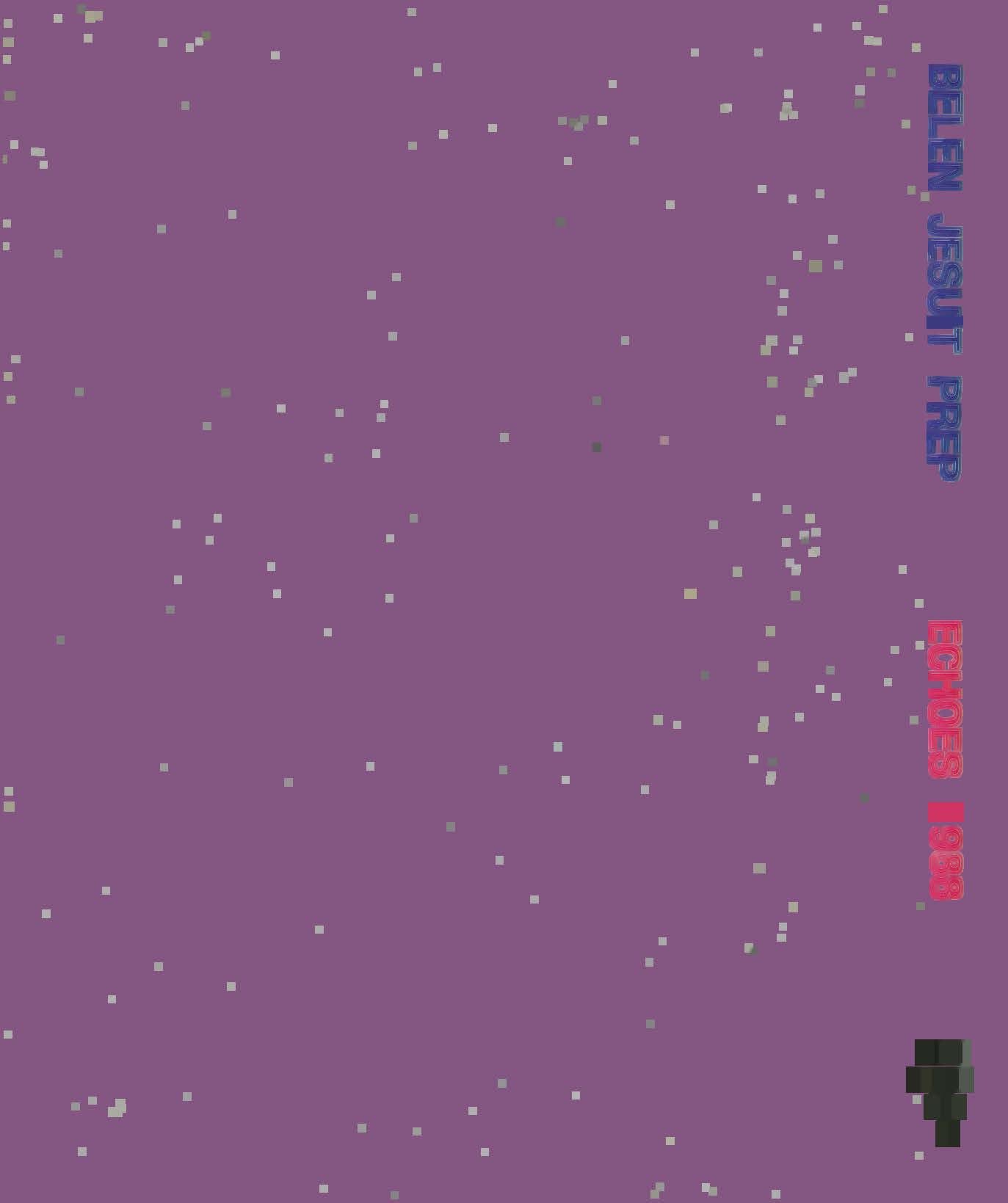 V olume 26 of Echoes was produced by the 198B Belen Jesuit Peep Yearbook Staff, with the most magnanimous aid of the Taylor Publishing Company. Echoes is now 352 pages long, with a press run of 900 copies. The book is 9 x 12 inches and is printed on 22 signatures of 80 lb. paper. Endsheets are 100 lb. high gloss enamel paper stock eith spot colors (Process Red #35, Super Blue #11, Brilliant Red #30, Brilliant Yellow #51, Emerald Green #22) at 100% The cover is 160 pt. Binder ' s Board, smythe sewn, rounded and backed kolbus lined and printed on lithocote material covered with plastic lamination. Camera ready art work for the cover was produced by Mr. Pierre Pierson after an original design of the Echoes editors with the assistance of Mr. Ken Thornberry , of the Taylor Publishing Company.