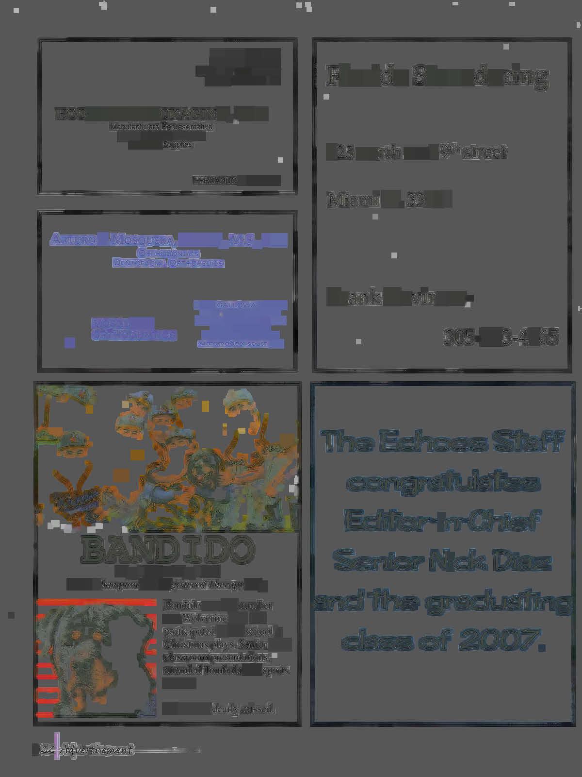 school history to be an all color D ook. the school had also achieved a etter status after J$ eing reviewed and accreditted by the SACS committee. our cover was vista custom and grained on 145 point J$ oard with a matt navy material and two silkscreen inks, golden yellow and white. the J$ ook was printed on eighty pound gloss paper, and our endsheets were four color litho different front and I; ack. our year J$ ook included a total of 336 pages printed in full color and no spot color was used. J$ ody copy and caption font was schnittger, and the headline was harold. we used !>oth ado ft: e photoshop 7.01 and ado J$ e indesign cs. our mug shot photos and pictures of special events were taken T$y foxmar studios. echoes is a mem l$ er of cspa, nspa, and jea. we would like to give special thanks to everyone who supported us throughout the year, especially father marcelino garcia sj, mr. jose roca and our iggest fan, father sardina, sj. we would also like to thank mr. victor arrieta, mr. thomas de quesada and mr. alex zequeira for providing us with the pictures and always on a timely J$ asis. we could not do it without them. last J$ ut not least, we would like to thank vicky and patty for always l> eing there for us. we appreciate your help and your understanding of our school's unique needs.