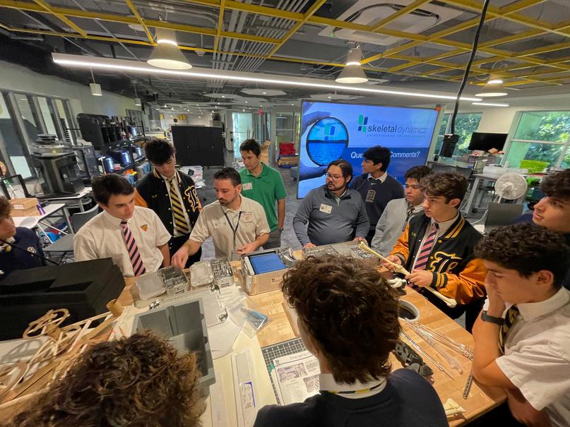 Mr Cruz’s Honors Principles of Engineering class welcomed alumni from Skeletal Dynamics Daniel Sixto ’16, Gabriel Mesa ’12, and Bobby Lacasa ’18 for an inside look at how ideas become real-world medical devices. After exploring the full design-to-distribution pipeline, students are taking inspiration into their next hands-on challenge: building interconnected Rube Goldberg machines that will join together into one class-wide chain reaction.