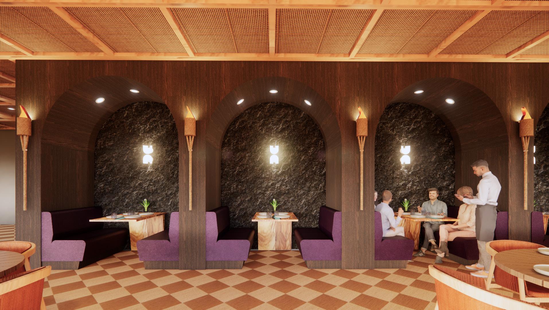 project description: Polu Wai, a gulfside Hawaiian fusion bar and restaurant, is designed to offer a welcoming and immersive dining experience that balances intimacy and community. Thoughtfully placed columns, partitions, and greenery create a sense of privacy without compromising openness, while warm lighting enhances the inviting ambiance. Pendant fixtures define communal areas, encouraging social interaction, while natural materials like wood and stone ground the space in authentic Hawaiian aesthetics. The overall design fosters a relaxed yet engaging atmosphere, making every visit both comfortable and memorable.