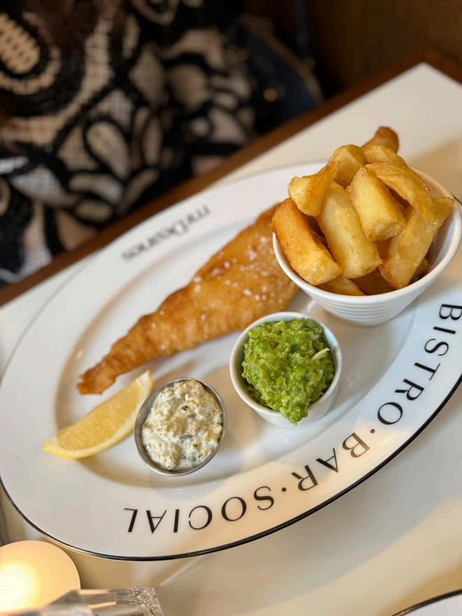 Beer battered line-caught haddock, chips, crushed peas & tartare. £19 95