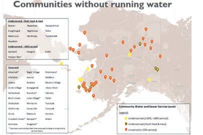 In Alaska, only 67% of households are serviced by public wastewater systems. The latest research from Indian Health Service found thirty-two communities remain unserved, where 45% or more homes have not been served either via pipe, septic tank and well, or covered haul system. An additional fourteen communities are underserved: they have limited water and sewage infrastructure that are badly in need of upgrade and repair. Most of the villages without running water are majority Alaskan Native.