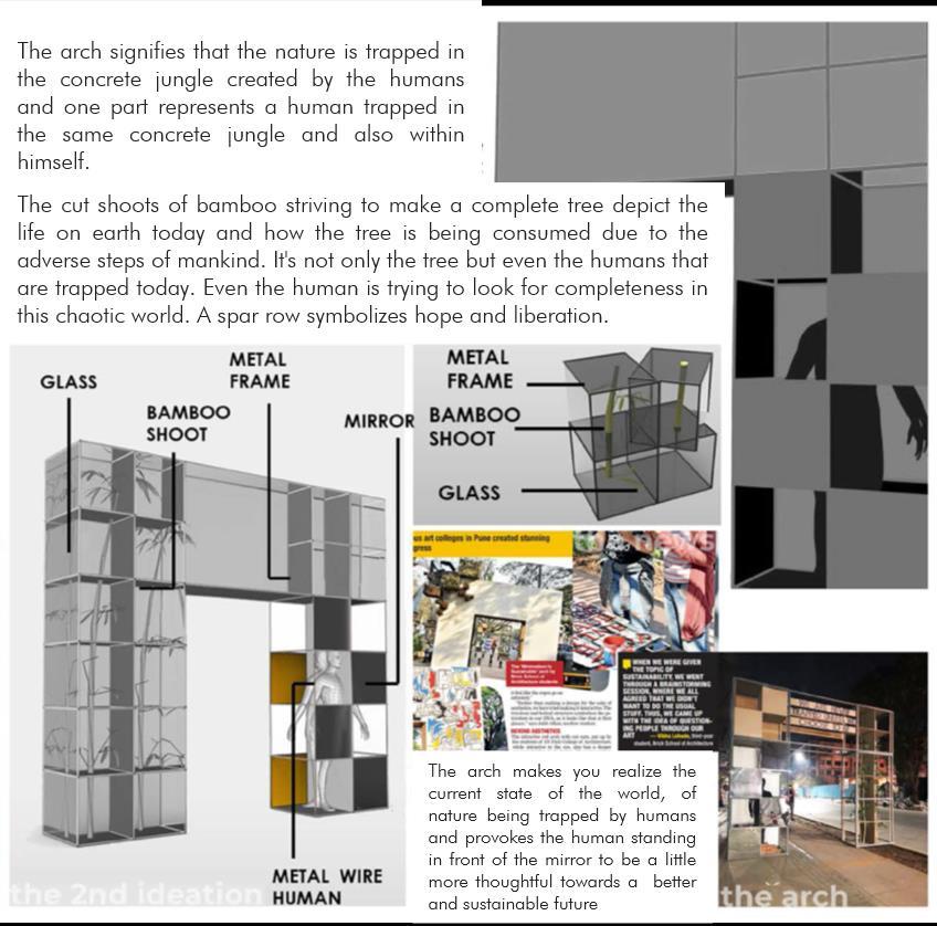 "The thought of minimalism is sustainable “ Sustainability does not only apply to the materials used but sustainability can also demonstrate ideas. A solid arch, by a minimal intervention can be highlighted to the required effect. There is optimum use of design strategies to make the design sustainable. The intervention when seen from a distance is visible as an organic composition but actually, it is made up of dry waste The cubes and the arch together create a new form, symbolically representing a new idea. The undesirable waste is symbolic to the thought of sustainability. The organic form breaks the monotony of rigidity of the volume. Lets take a vow to sustainability.