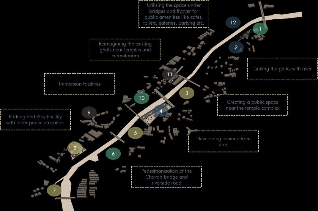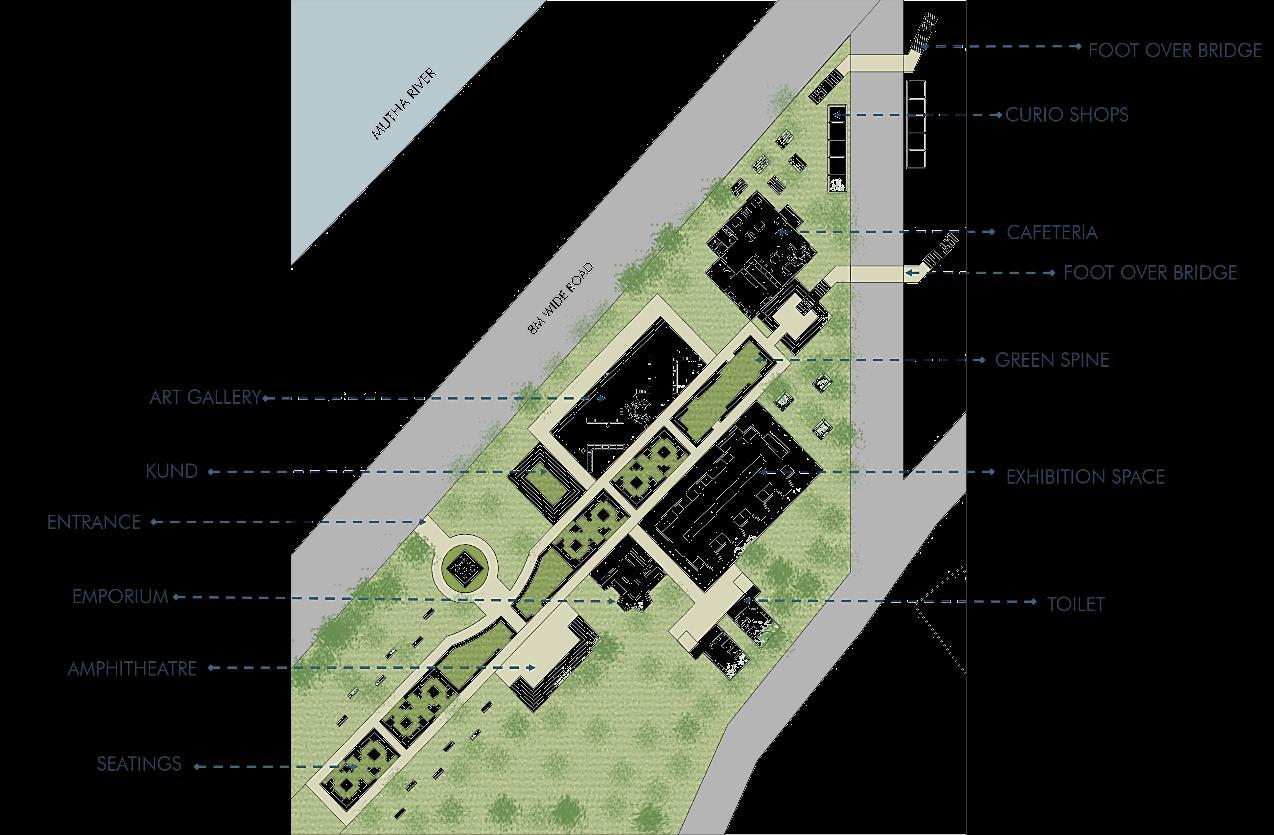 The aim of the project is to Identify and study the voids and design innovating ways to make them potential public spaces through various methods to increase public realm in Pune city. The plan focuses on enhancing the area as a social node with community activities and tourist participation that is high quality, conserving & enhancing the natural features, strengthening the traditional economic activities and improves the quality of life. The objective is to provide a thriving foreground where public spaces can function as a large public realm along the river for more richer experience is important in growing cities.