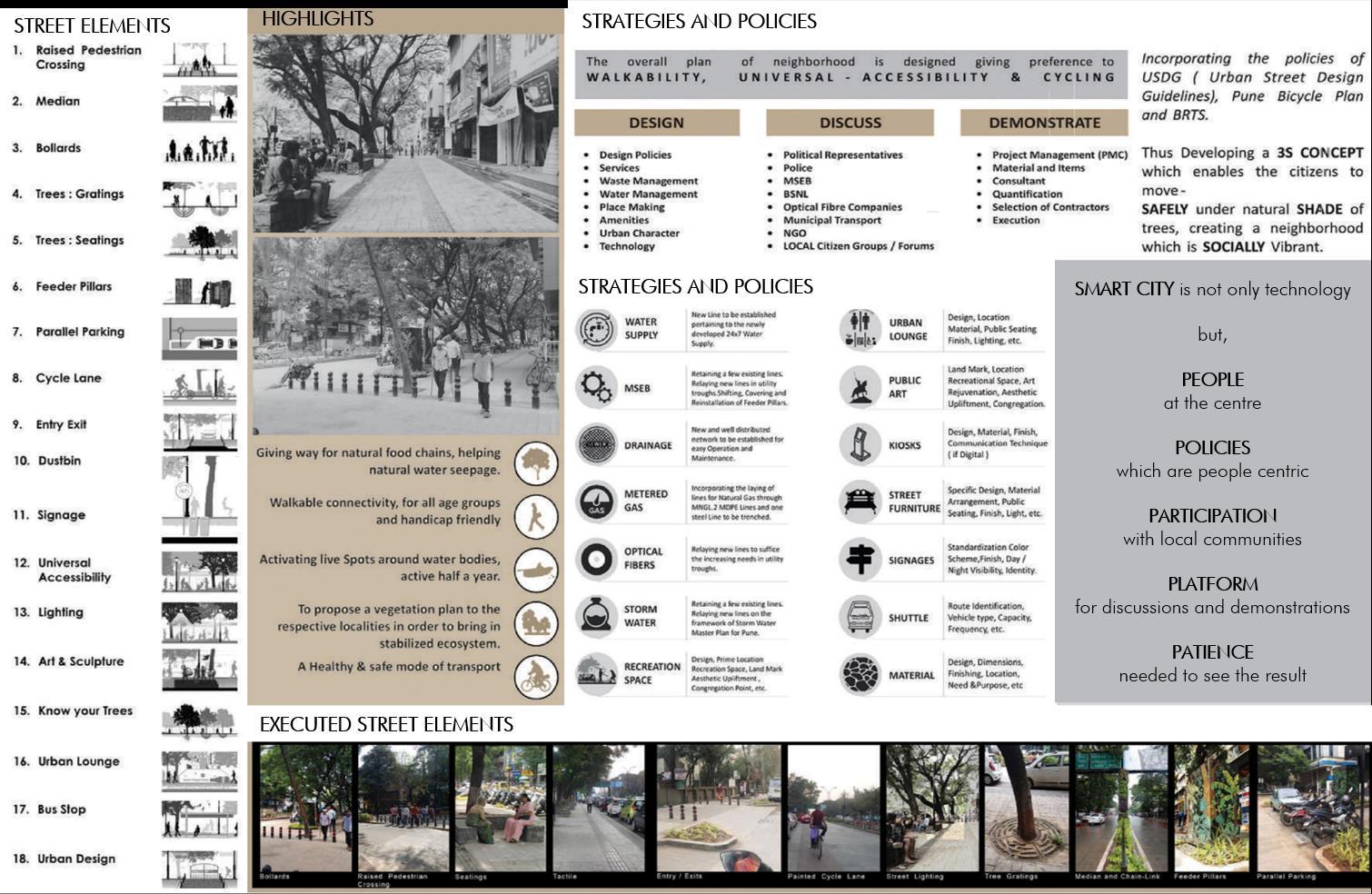 The overall plan consists of Neighborhood streets under 6 Metro Stations which will be designed giving preference to Walkabilty, Universal Accessibility & Cycling, Incorporating the Policies of USDG (Urban Street Design Guidelines), Pune Bicycle Plan, BRTS and Comprehensive Mobility Plan adopted by PMC.