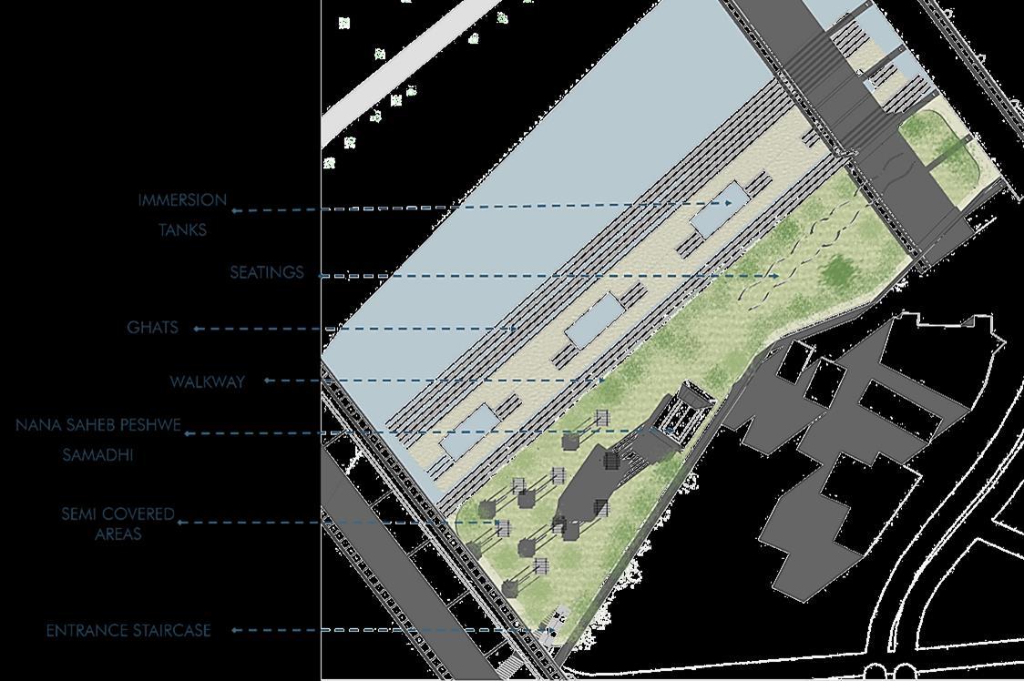 Ghats along the river with emersion tanks for ganpati visarjan with seatings and semi open areas PLAN